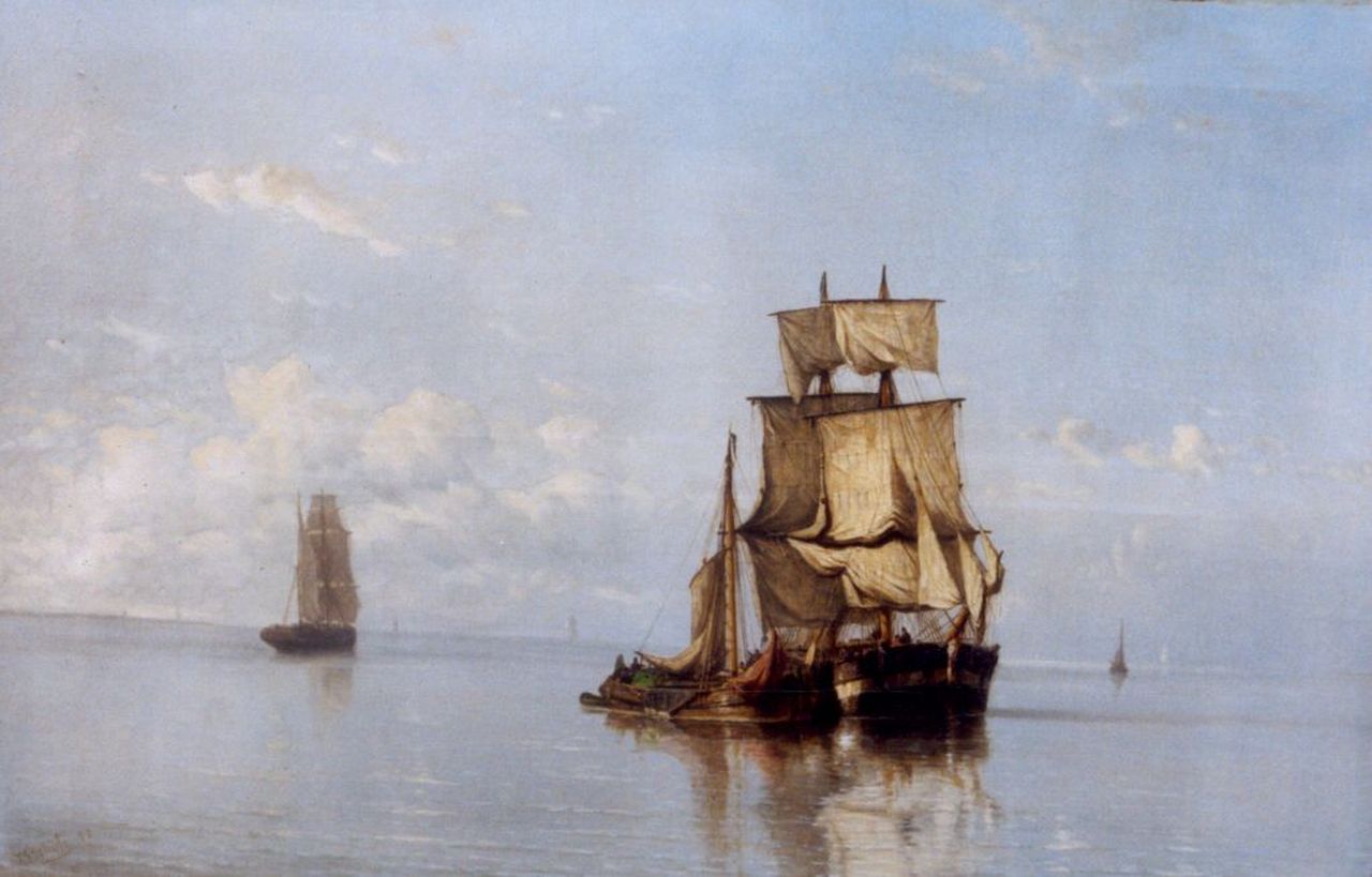 Jan Frederik Schütz kunstwerk • schilderij • voorheen te koop Drie schepen op kalme zee