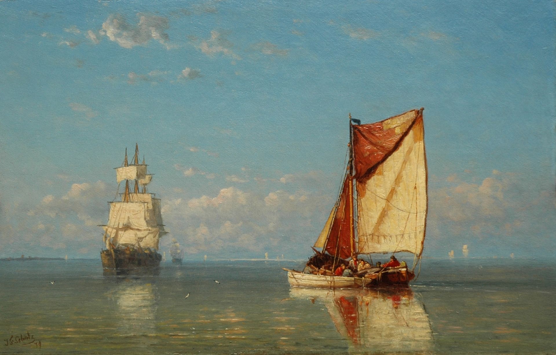 Jan Frederik Schütz kunstwerk • schilderij • voorheen te koop Driemaster en vissersvaartuig op Zeeuwse wateren