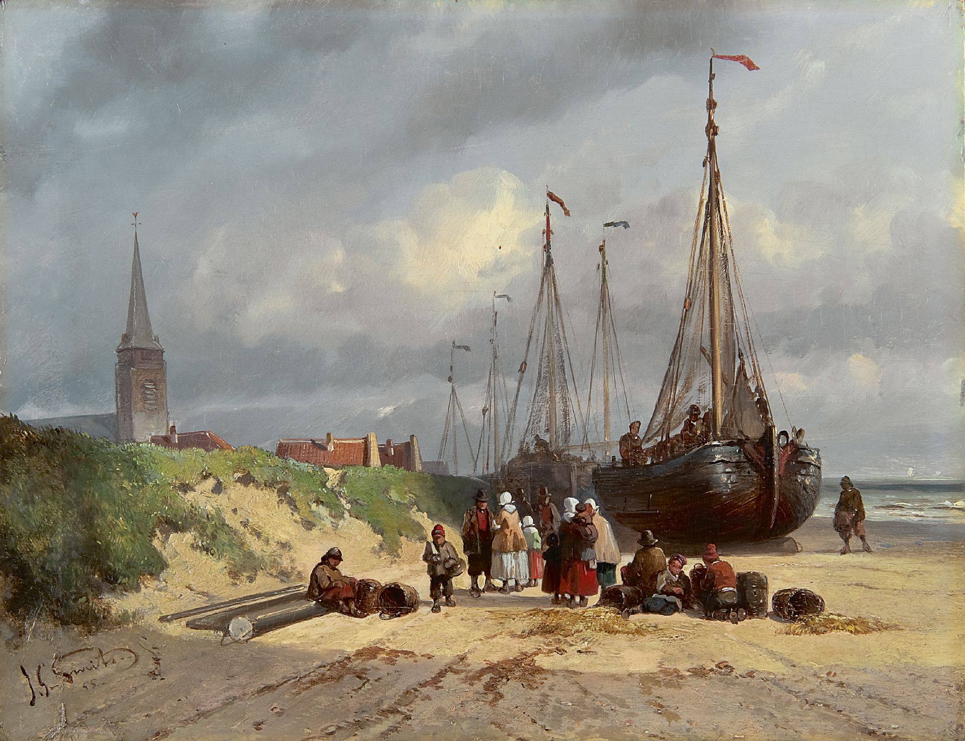 Jan Gerard Smits kunstwerk • schilderij • voorheen te koop Bomschuiten en vissers op het strand van Scheveningen