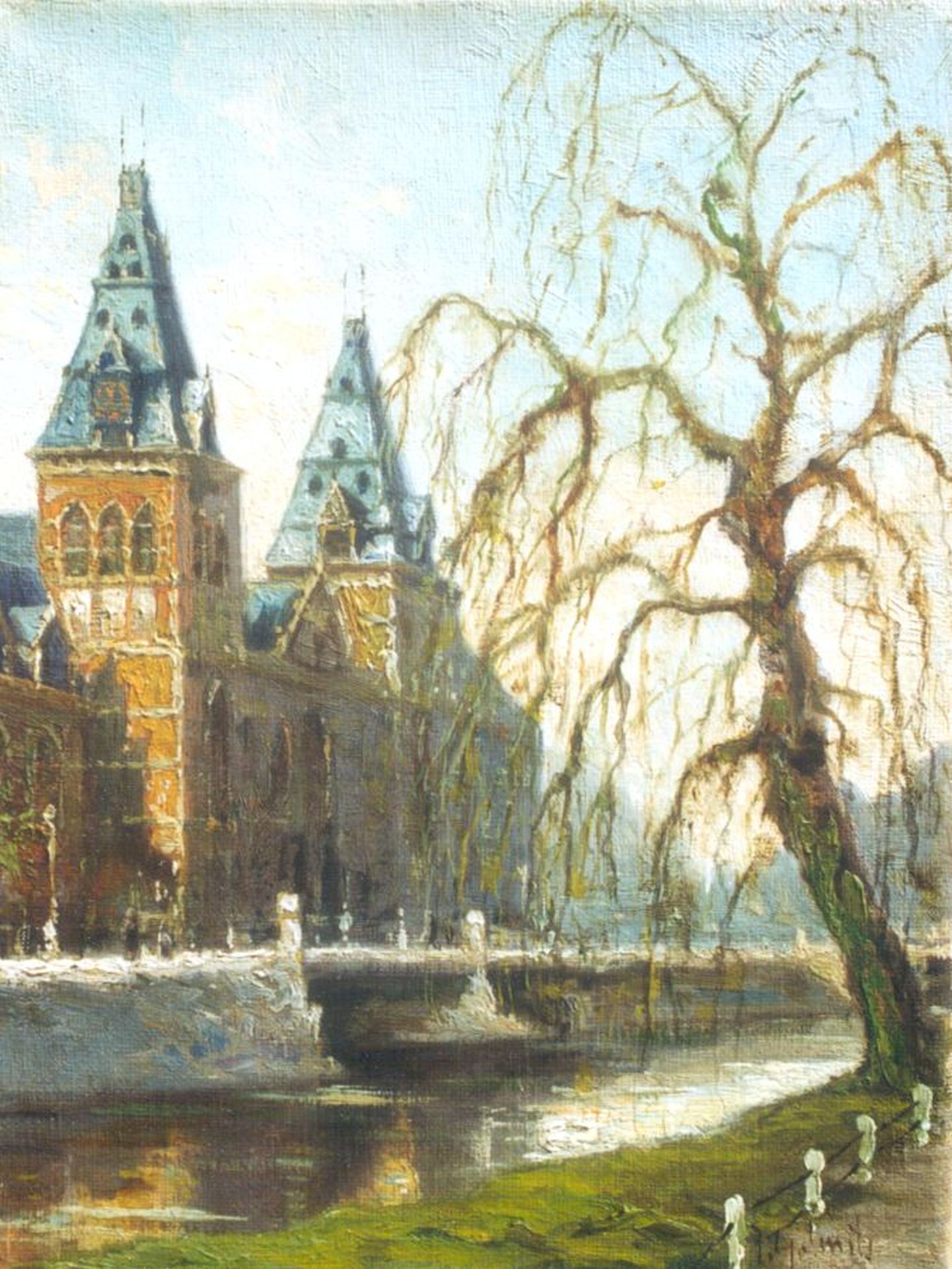 Jan Gerard Smits kunstwerk • schilderij • voorheen te koop Gezicht op het Rijksmuseum, Amsterdam