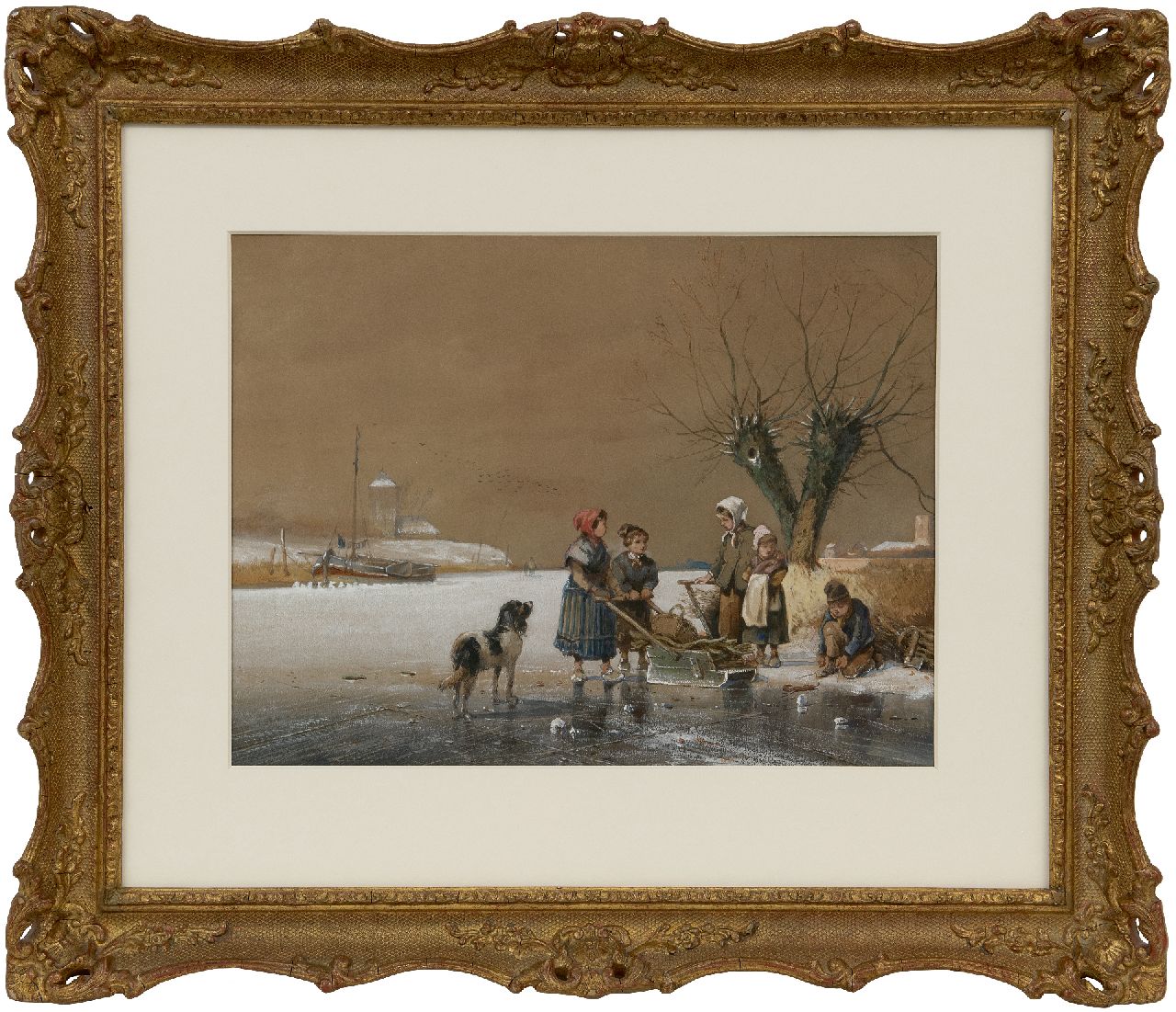 Jan Gerard Smits kunstwerk • aquarel • tekening • voorheen te koop Kinderen op het ijs