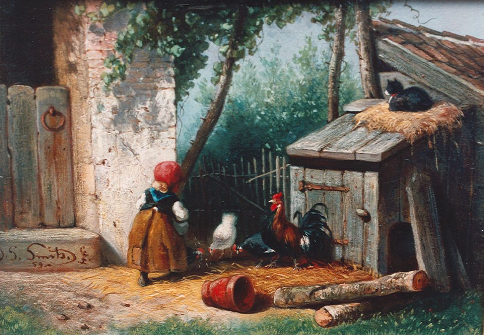 Jan Gerard Smits kunstwerk • schilderij • voorheen te koop Meisje voert de kippen