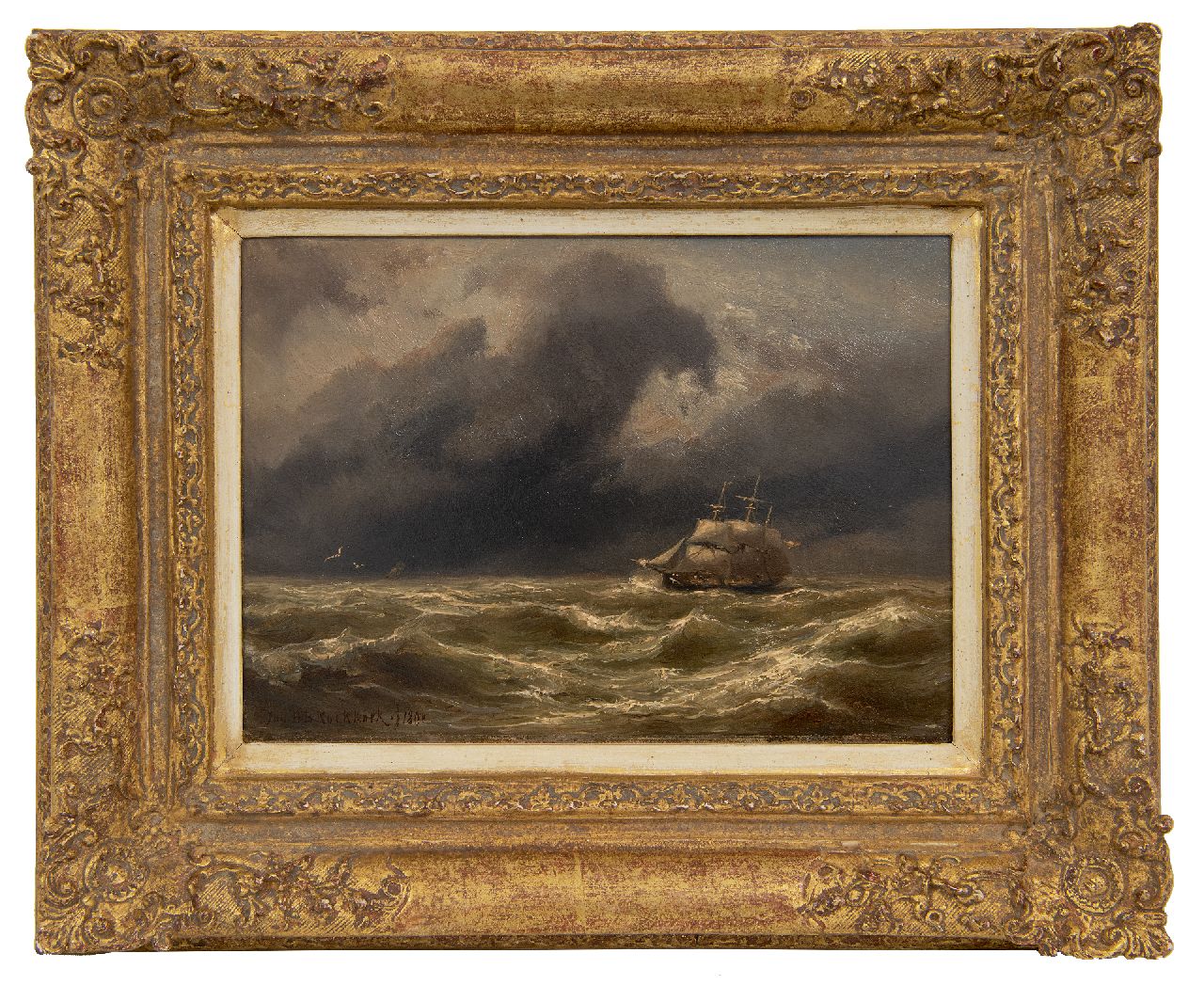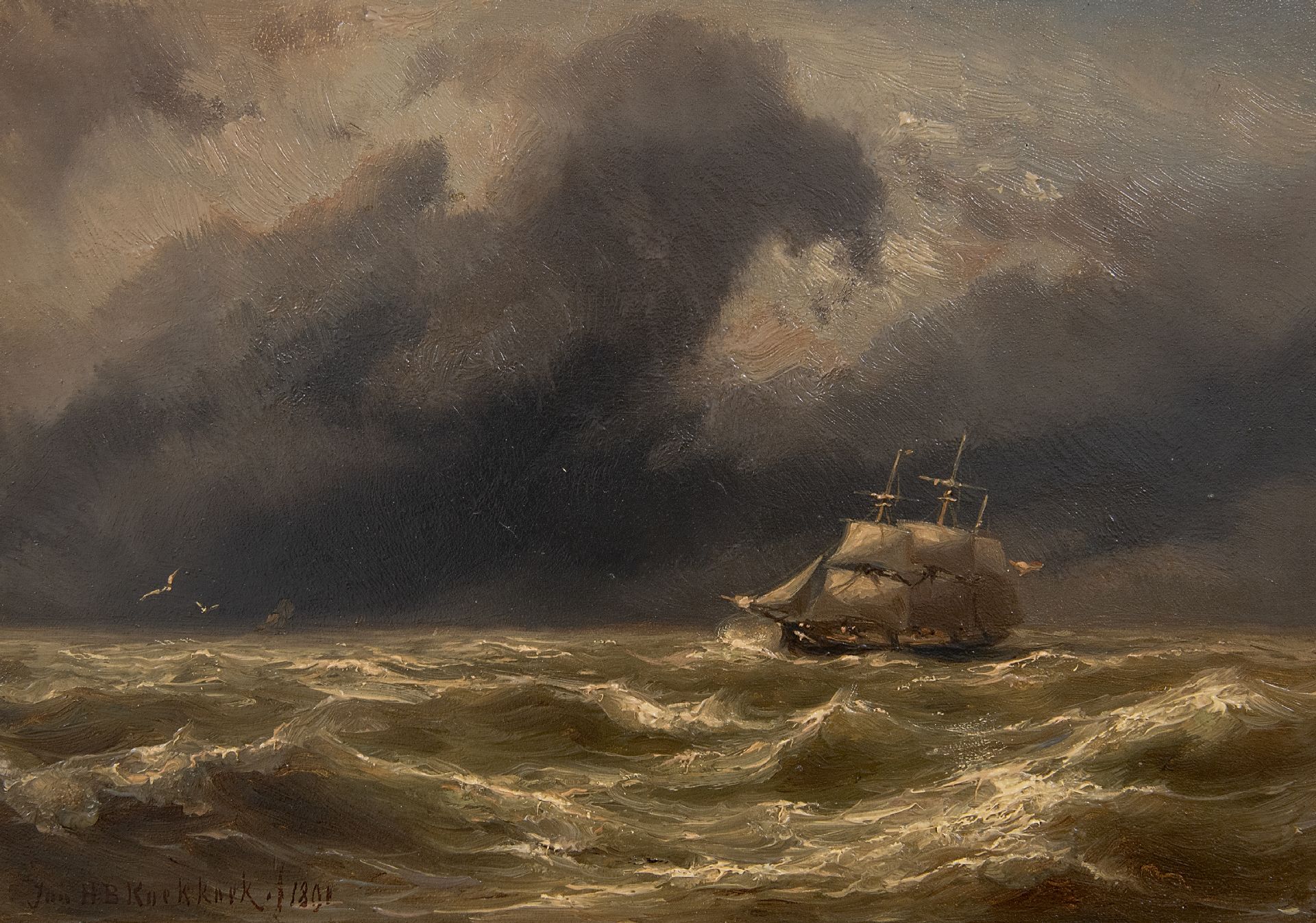 Jan H.B. Koekkoek kunstwerk • schilderij • voorheen te koop Driemaster op zee in een storm