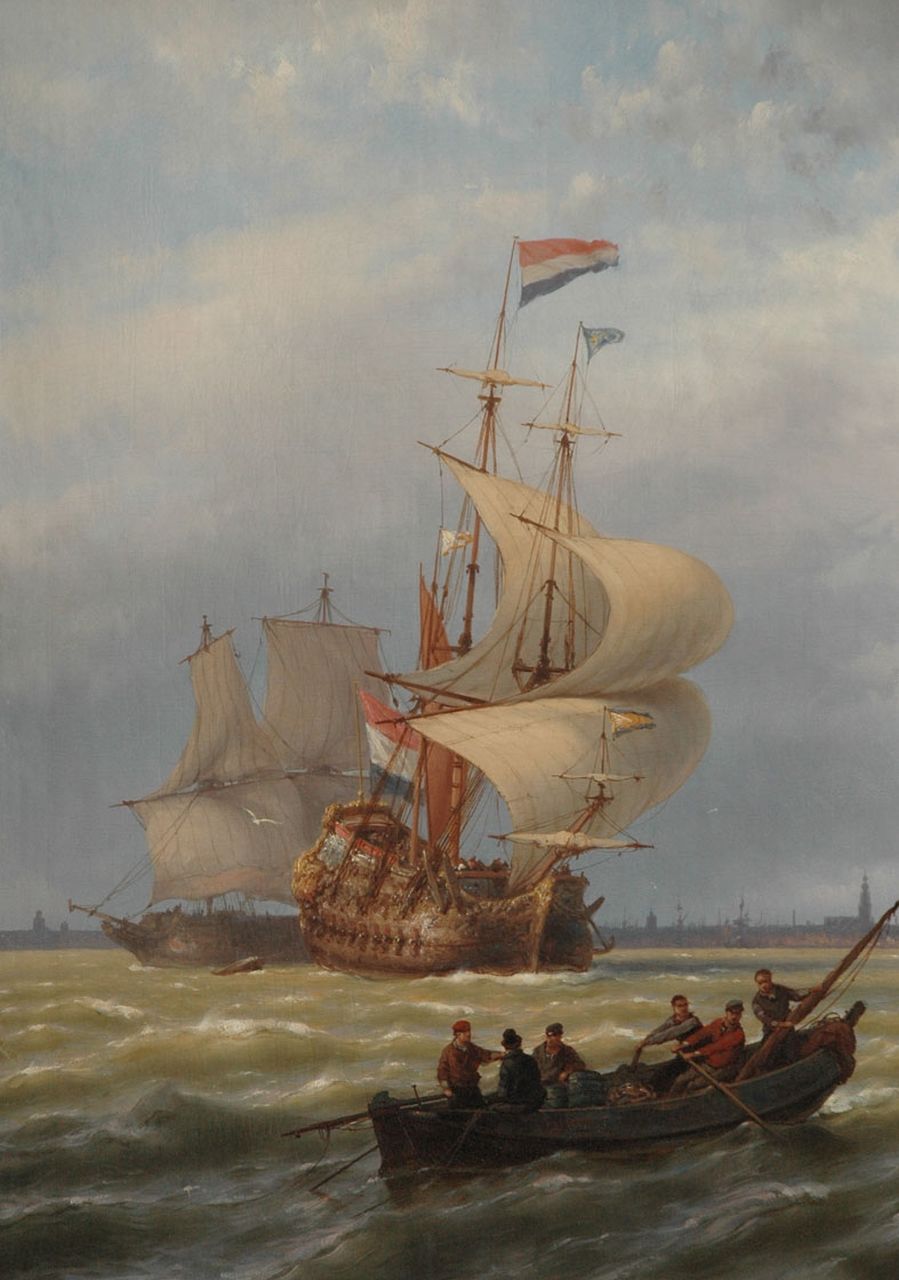 Jan H.B. Koekkoek kunstwerk • schilderij • voorheen te koop Een 17e-eeuws oorlogsschip onder zeil op het IJ voor Amsterdam