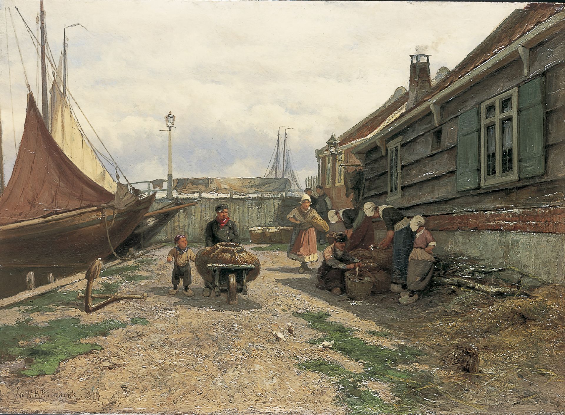 Jan H.B. Koekkoek kunstwerk • schilderij • voorheen te koop Haven van Zuiderzeestadje met visverkoopsters