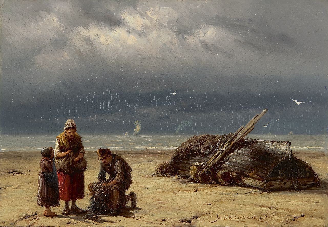 Jan H.B. Koekkoek, de derde zoon van de marineschilder Hermanus Koekkoek sr., was van zijn vier zonen de meest veelzijdige. Ook hij kreeg les van zijn vader, van wie de invloed nog duidelijk zichtbaar is in de zorgvuldige schildertrant en fijne detaillering van zijn vroege zee- en riviergezichten. In latere jaren zocht Jan H.B. steeds meer aansluiting met de Haagse School, trok hij richting het Gooi en schilderde hij strand- en zeegezichten en scènes uit het vissersleven in een losse schilderstijl en helder kleurpalet. Hij is daarmee een goed voorbeeld van hoe de schilderkunst eind 19e eeuw veranderde. Alhoewel de ‘romantiek ’nog niet uit zijn schilderijen verdwenen was werd het duidelijk dat er langzaamaan een nieuwe tijd zou aanbreken.