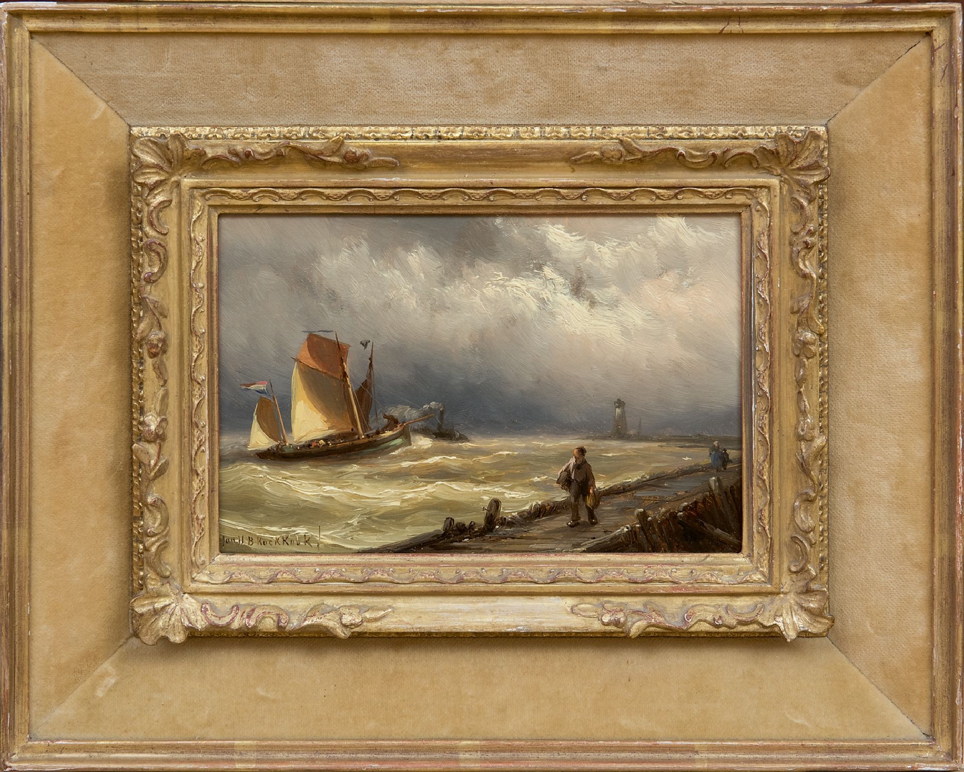Jan H.B. Koekkoek, de derde zoon van de marineschilder Hermanus Koekkoek sr., was van zijn vier zonen de meest veelzijdige. Ook hij kreeg les van zijn vader, van wie de invloed nog duidelijk zichtbaar is in de zorgvuldige schildertrant en fijne detaillering van zijn vroege zee- en riviergezichten. In latere jaren zocht Jan H.B. steeds meer aansluiting met de Haagse School, trok hij richting het Gooi en schilderde hij strand- en zeegezichten en scènes uit het vissersleven in een losse schilderstijl en helder kleurpalet. Hij is daarmee een goed voorbeeld van hoe de schilderkunst eind 19e eeuw veranderde. Alhoewel de ‘romantiek ’nog niet uit zijn schilderijen verdwenen was werd het duidelijk dat er langzaamaan een nieuwe tijd zou aanbreken.