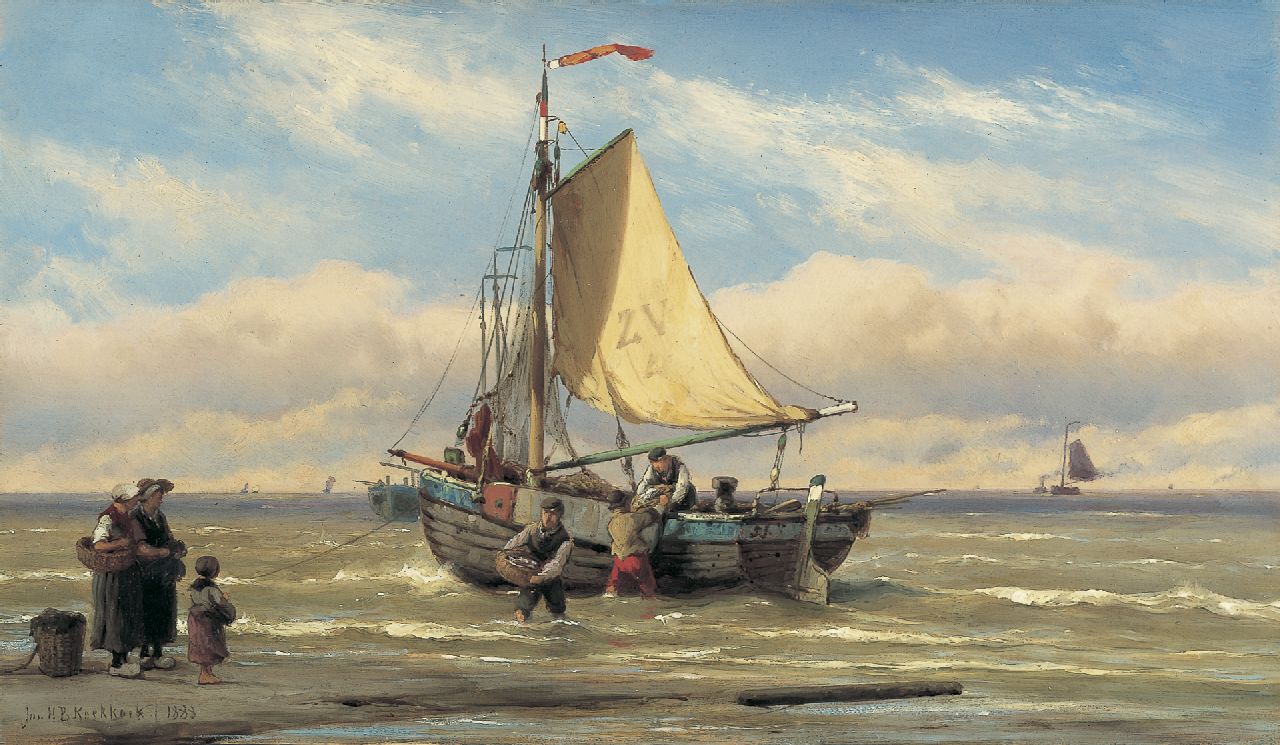 Jan H.B. Koekkoek kunstwerk • schilderij • voorheen te koop Het uitladen van de vangst, Zandvoort