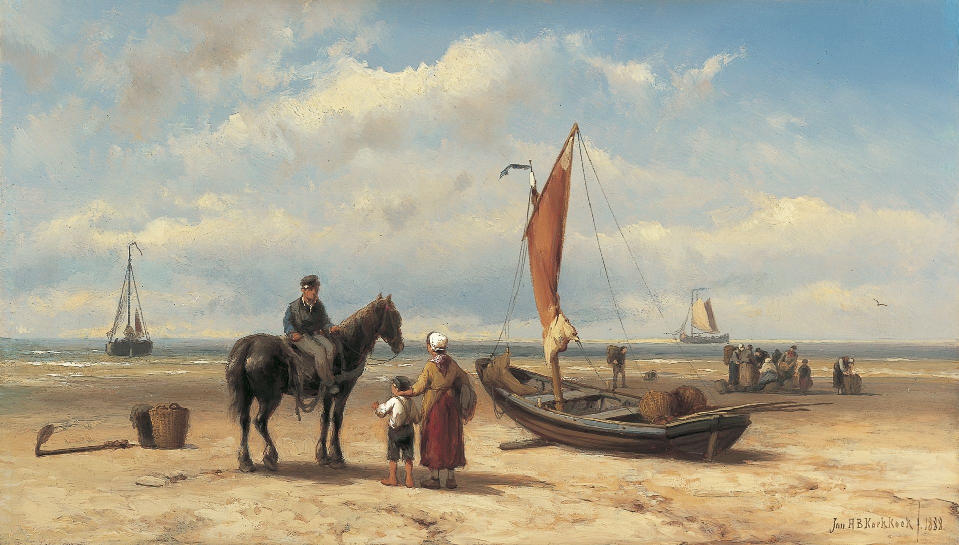 Jan H.B. Koekkoek, de derde zoon van de marineschilder Hermanus Koekkoek sr., was van zijn vier zonen de meest veelzijdige. Ook hij kreeg les van zijn vader, van wie de invloed nog duidelijk zichtbaar is in de zorgvuldige schildertrant en fijne detaillering van zijn vroege zee- en riviergezichten. In latere jaren zocht Jan H.B. steeds meer aansluiting met de Haagse School, trok hij richting het Gooi en schilderde hij strand- en zeegezichten en scènes uit het vissersleven in een losse schilderstijl en helder kleurpalet. Hij is daarmee een goed voorbeeld van hoe de schilderkunst eind 19e eeuw veranderde. Alhoewel de ‘romantiek ’nog niet uit zijn schilderijen verdwenen was werd het duidelijk dat er langzaamaan een nieuwe tijd zou aanbreken.