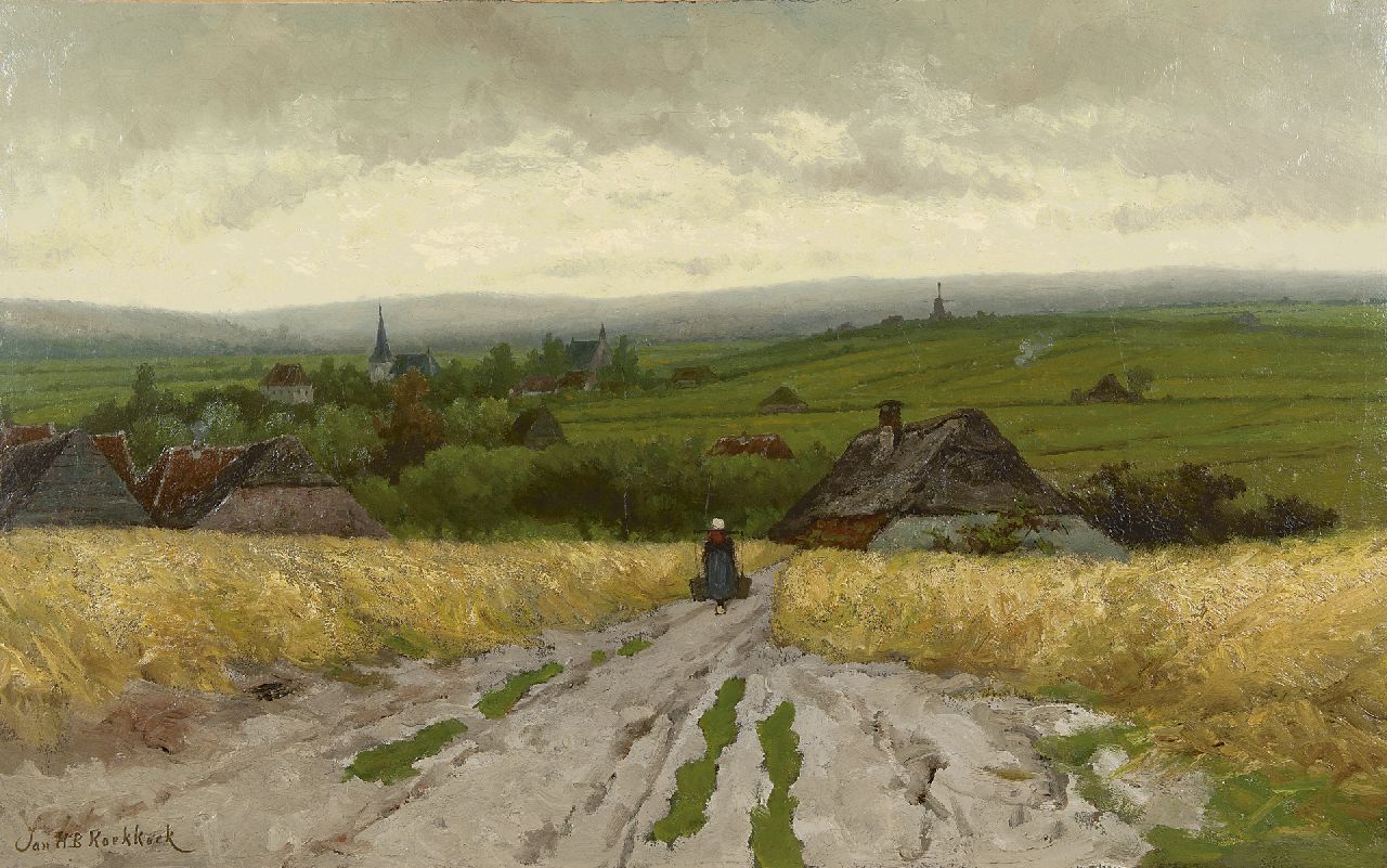 Jan H.B. Koekkoek kunstwerk • schilderij • voorheen te koop Panoramisch landschap met boerin op landweg