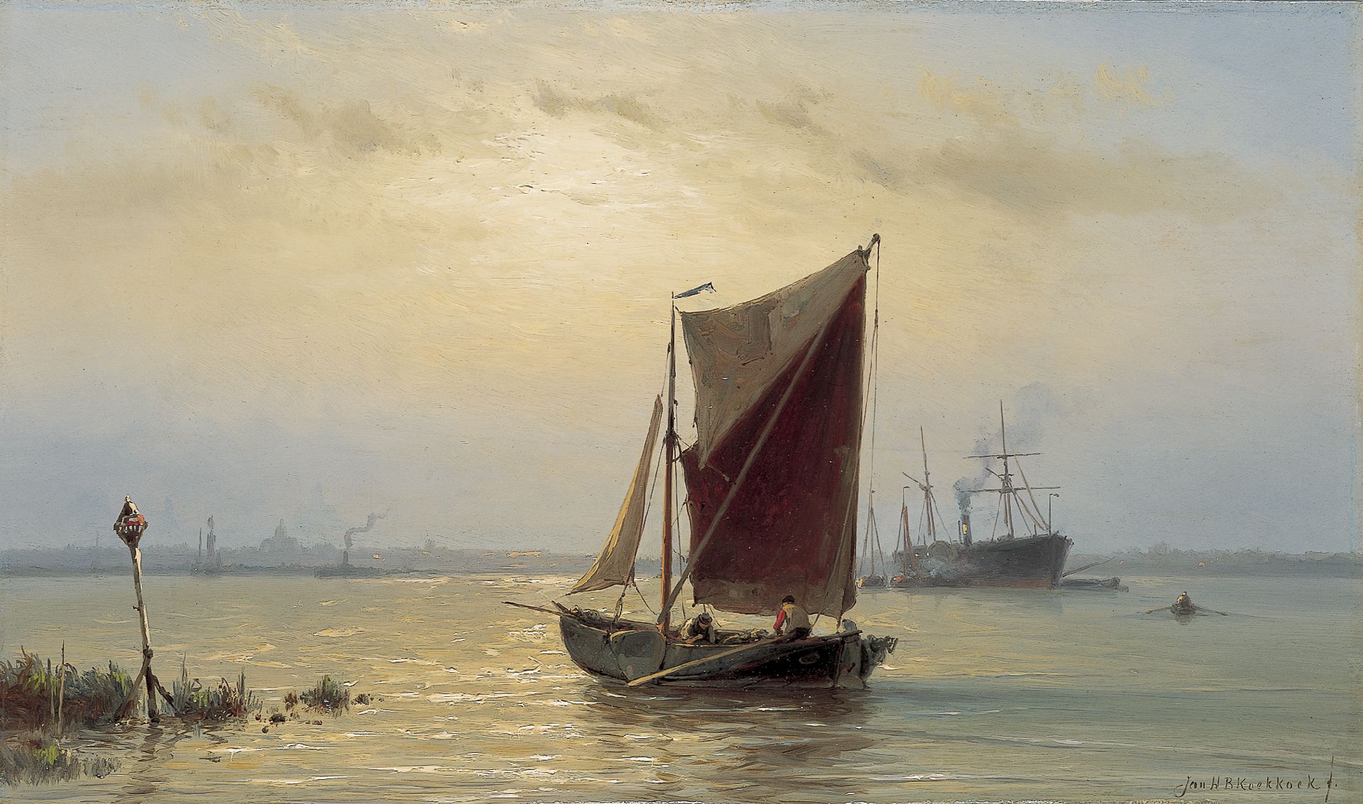 Jan H.B. Koekkoek kunstwerk • schilderij • voorheen te koop Schepen op de Maas bij Rotterdam