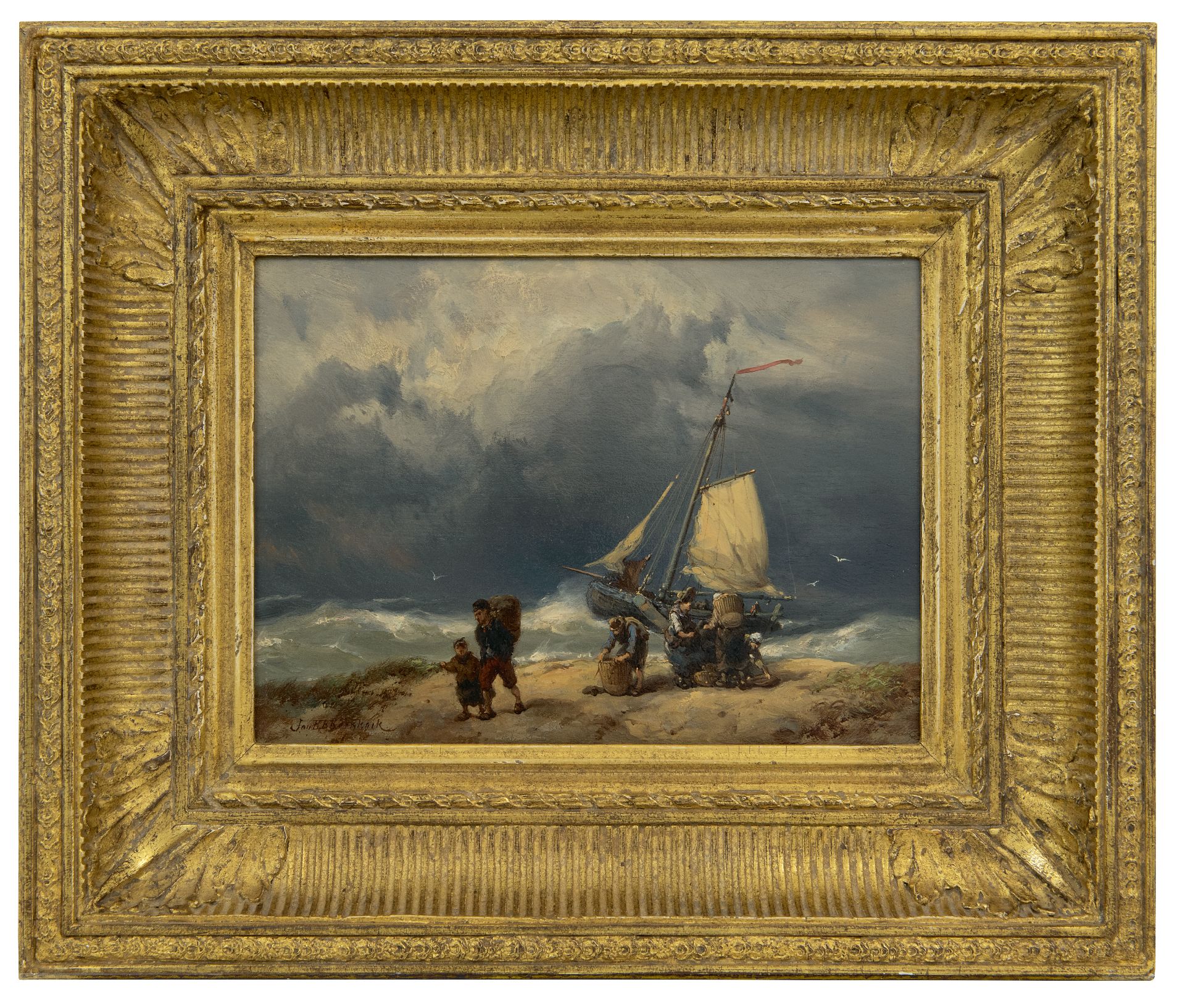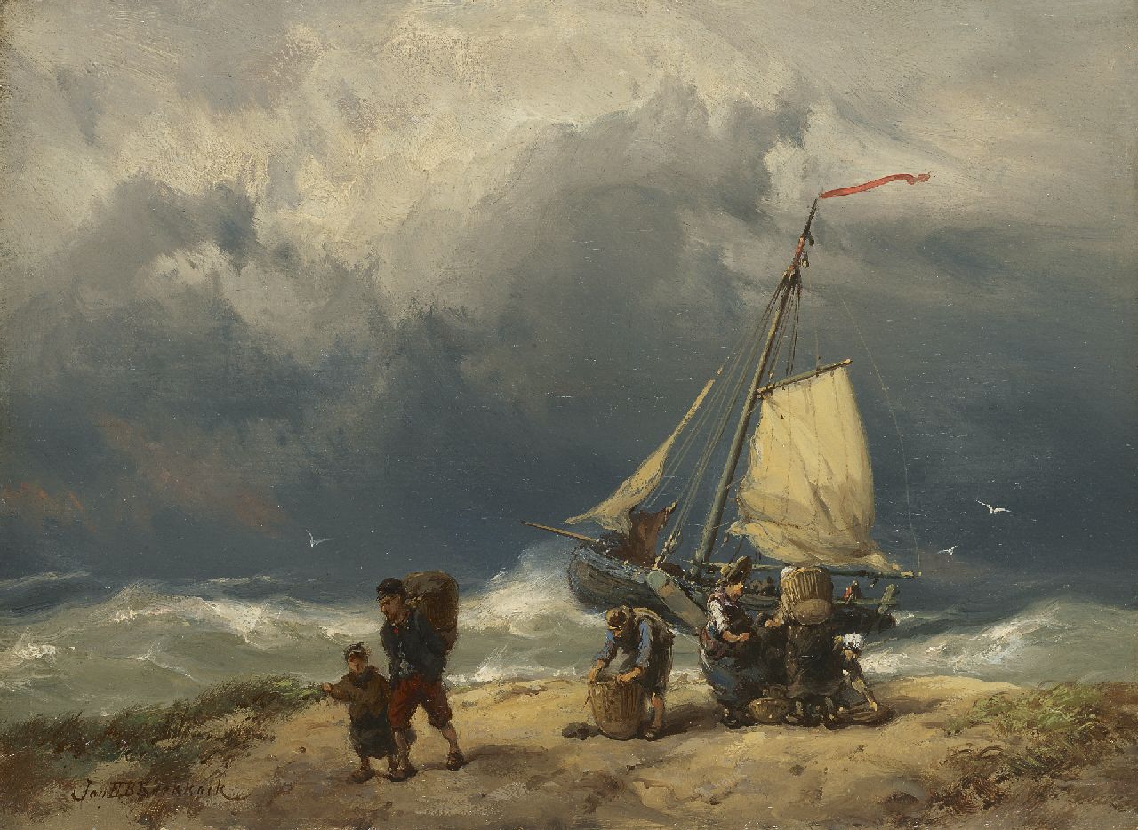 Jan H.B. Koekkoek kunstwerk • schilderij • te koop Vissersvolk op het strand in een storm