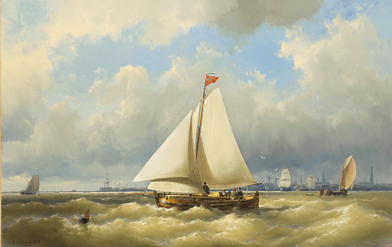Jan H.B. Koekkoek kunstwerk • schilderij • voorheen te koop Zeilende boeier voor het havenfront van Amsterdam