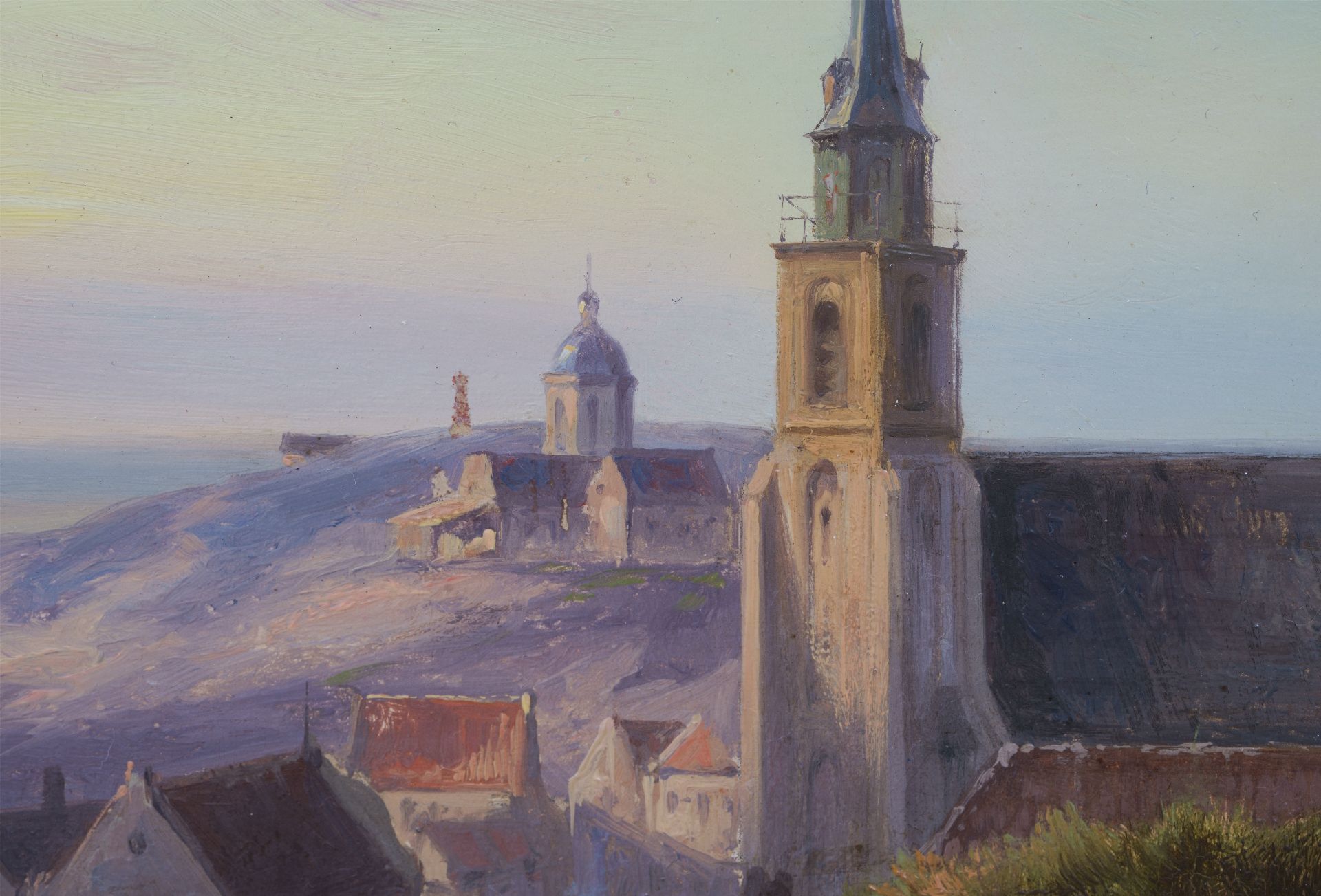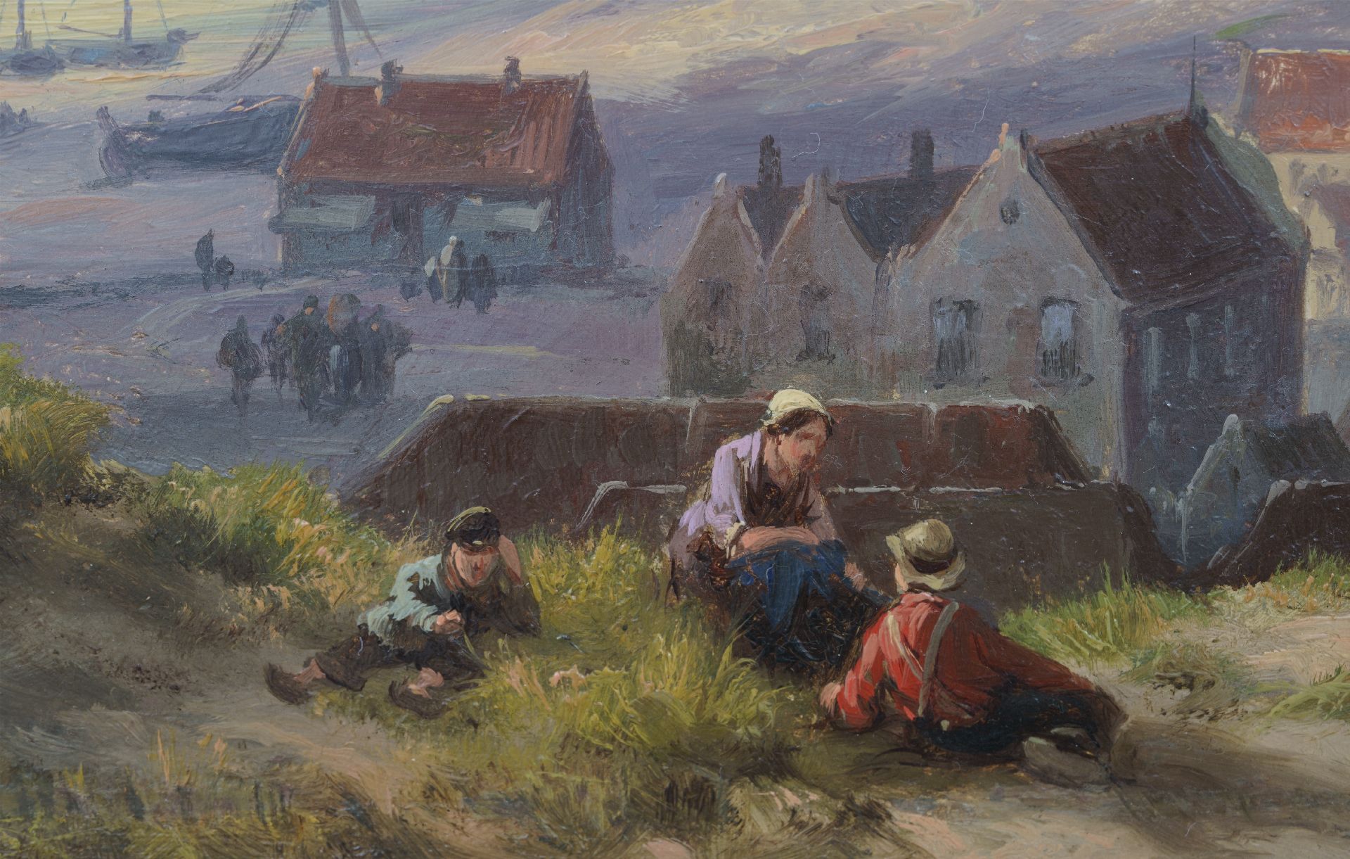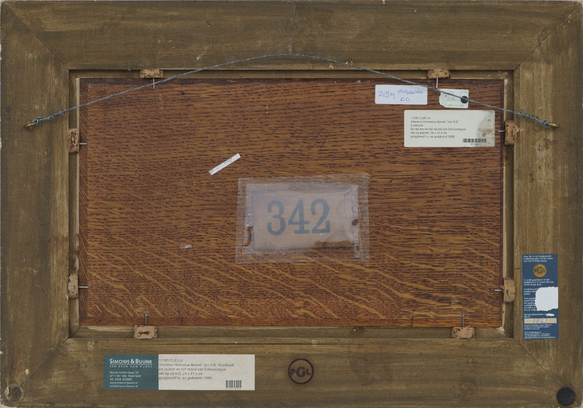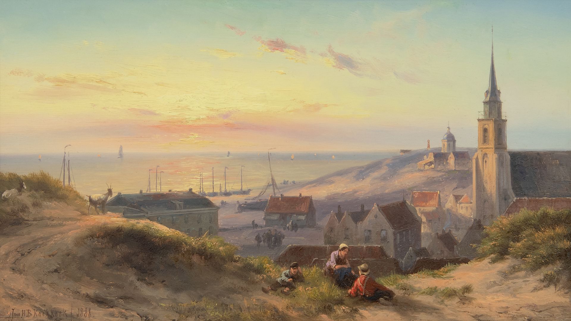 Jan H.B. Koekkoek was de derde zoon van de romantische marineschilder Hermanus Koekkoek, en kreeg les van zijn vader. Diens invloed is nog duidelijk zichtbaar in de zorgvuldige schildertrant en fijne detaillering van zijn vroege zee- en riviergezichten. In latere jaren zocht hij steeds meer aansluiting met de Haagse School en schilderde hij strand- en zeegezichten in een wat lossere schilderstijl. Dit gezicht op de kop van Scheveningen bij de Keizerstraat is tamelijk uniek. We zien rechts de Oude Kerk en daarachter, op het hoge duin naast het Seinpostduin, de koepel van (dominee) Faassen de Heer. Na diens dood in 1840 werd de koepel gebruikt als uitspanning. Het bouwwerk, dat karakteristiek was voor het oude Scheveningen, werd in 1889 afgebroken. Links in beeld zien we, half verscholen achter het duin, Hotel Zeerust. Grappig is dat Koekkoek het hotel schildert in de situatie van voor de verbouwing en vernieuwing van 1882. Hij heeft dus waarschijnlijk oudere schetsen gebruikt.