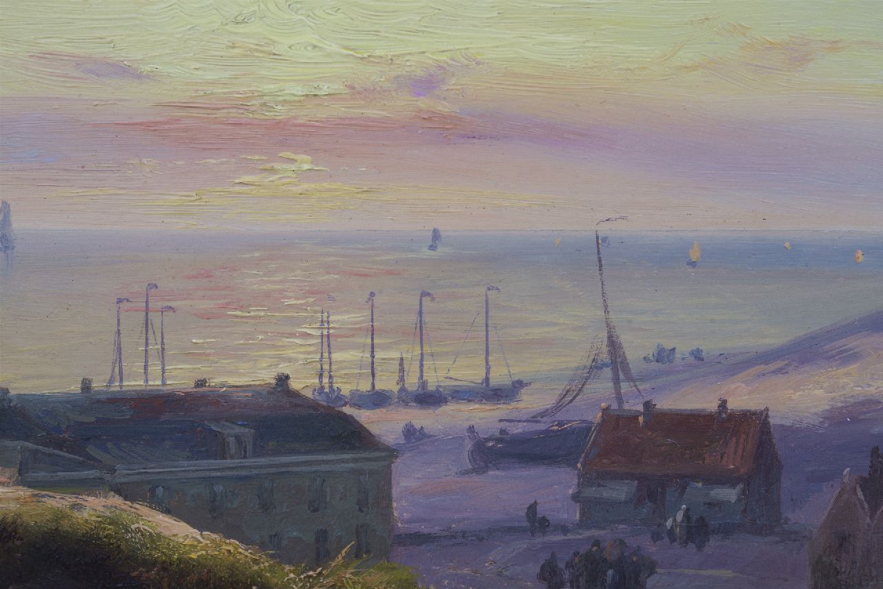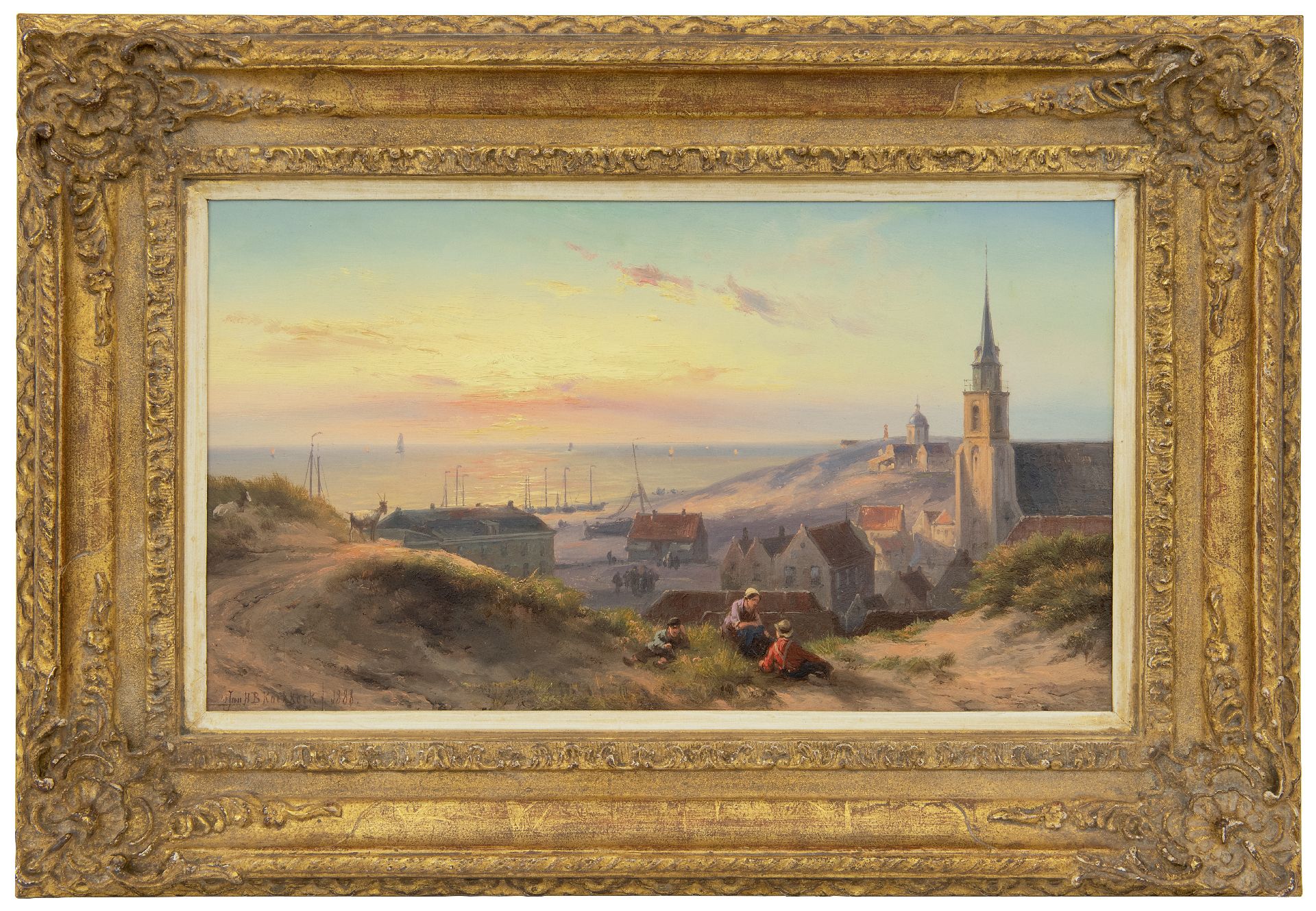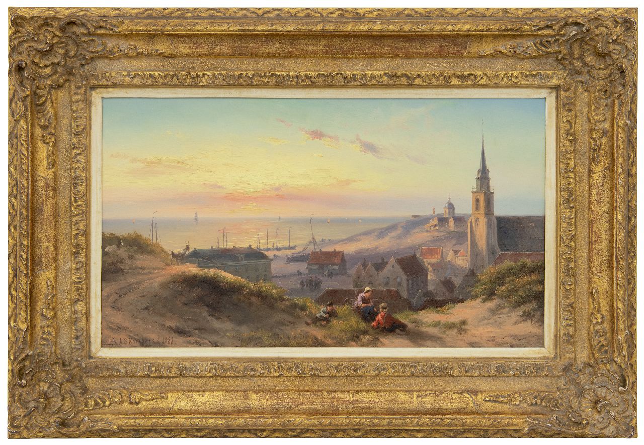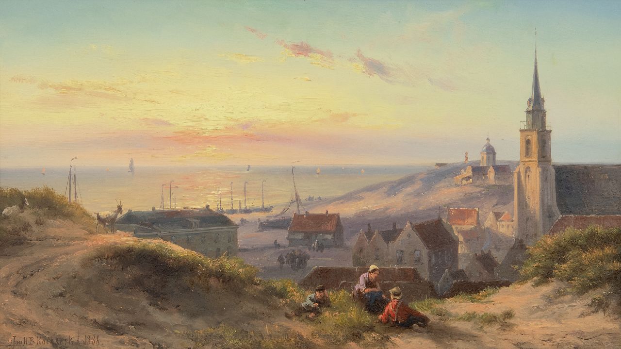 Jan H.B. Koekkoek kunstwerk • schilderij • voorheen te koop Zonsondergang aan het strand van Scheveningen met de Oude Kerk en de koepel van Faassen