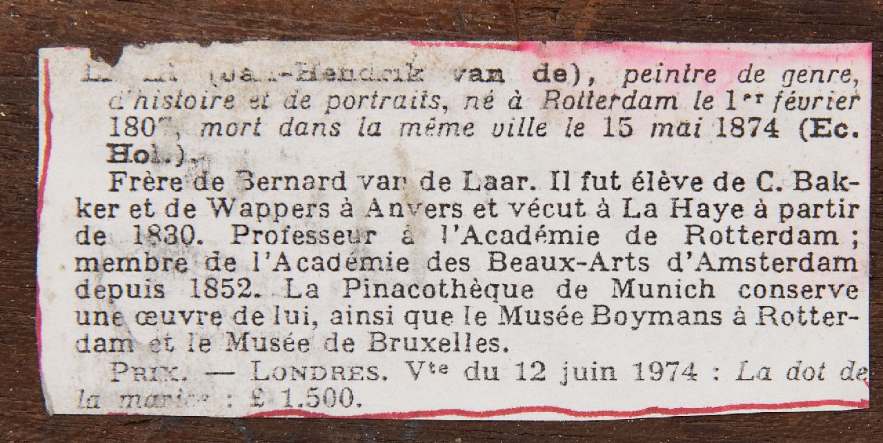 J.H. van de Laar was leerling van de Antwerpse Akademie en van de Akademie van Beeldende Kunsten te Den Haag. Vanaf 1841 was hij werkzaam in Rotterdam en directeur van de in 1850 opgerichte akademie. Hij schilderde voornamelijk portretten, genrestukken en historische voorstellingen.