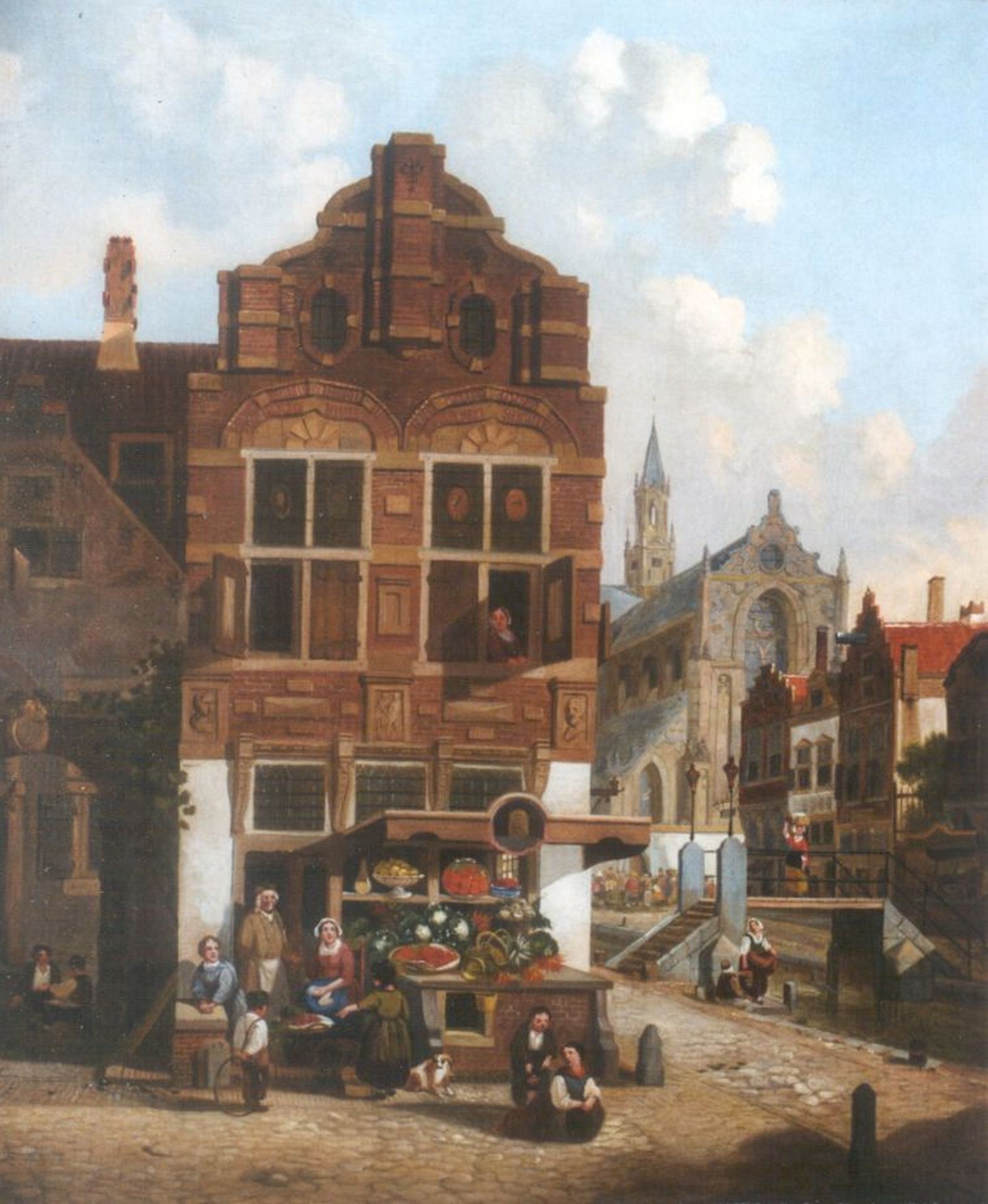 Jan Hendrik Verheijen kunstwerk • schilderij • voorheen te koop Figuren bij een groentekraam