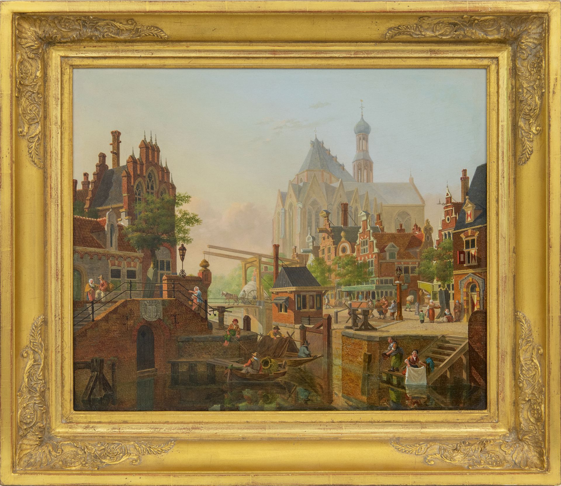 Jan Hendrik Verheijen kunstwerk • schilderij • te koop Hollands stadsgezicht met sluisje en bedrijvigheid op de kade