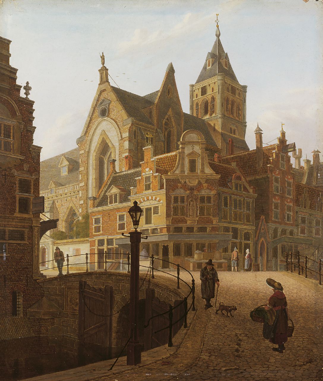 Jan Hendrik Verheijen kunstwerk • schilderij • voorheen te koop Stadsgezicht met wandelaars op een brug