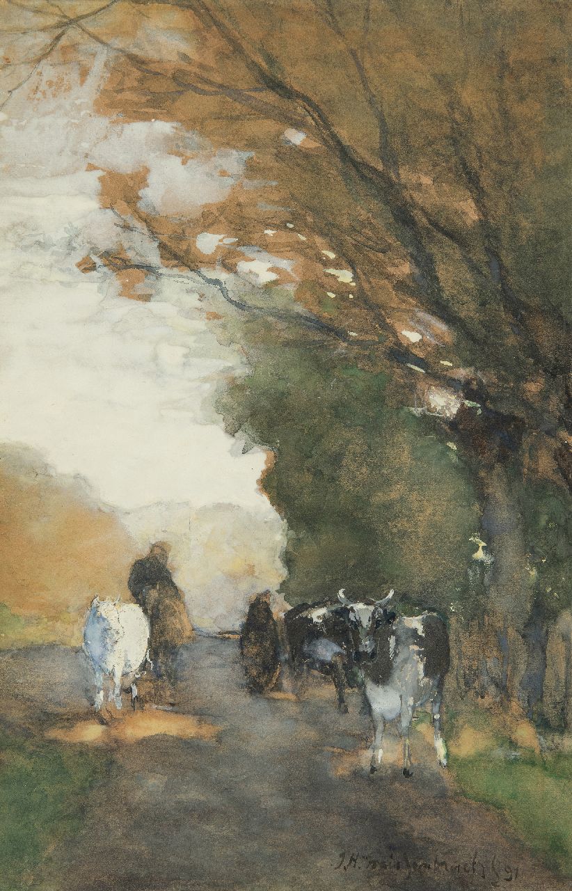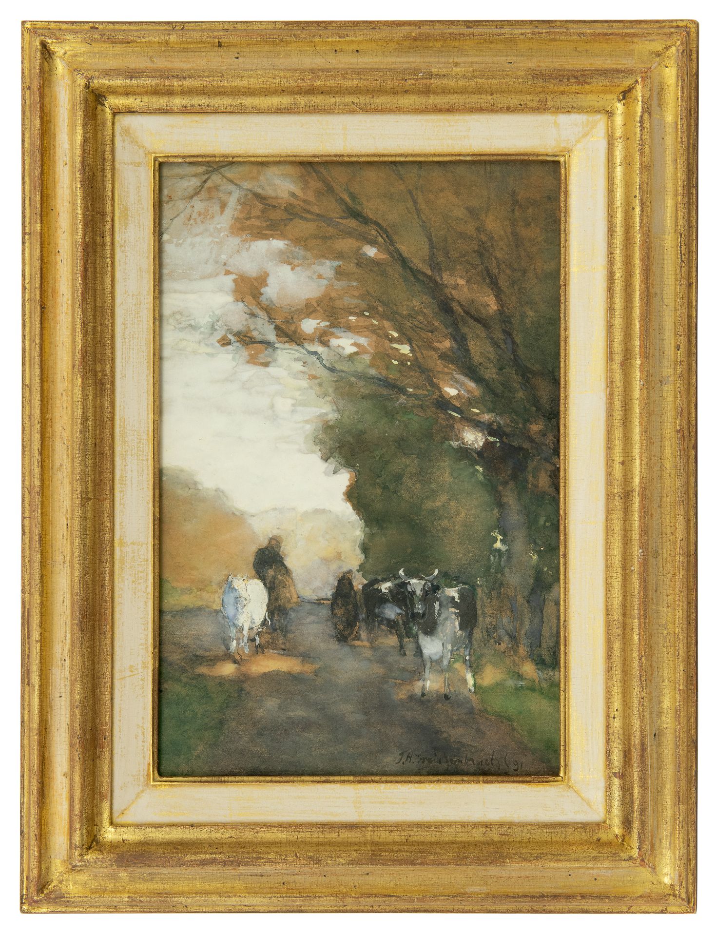 Jan Hendrik Weissenbruch kunstwerk • aquarel • tekening • voorheen te koop Koeien op pad langs de bosrand