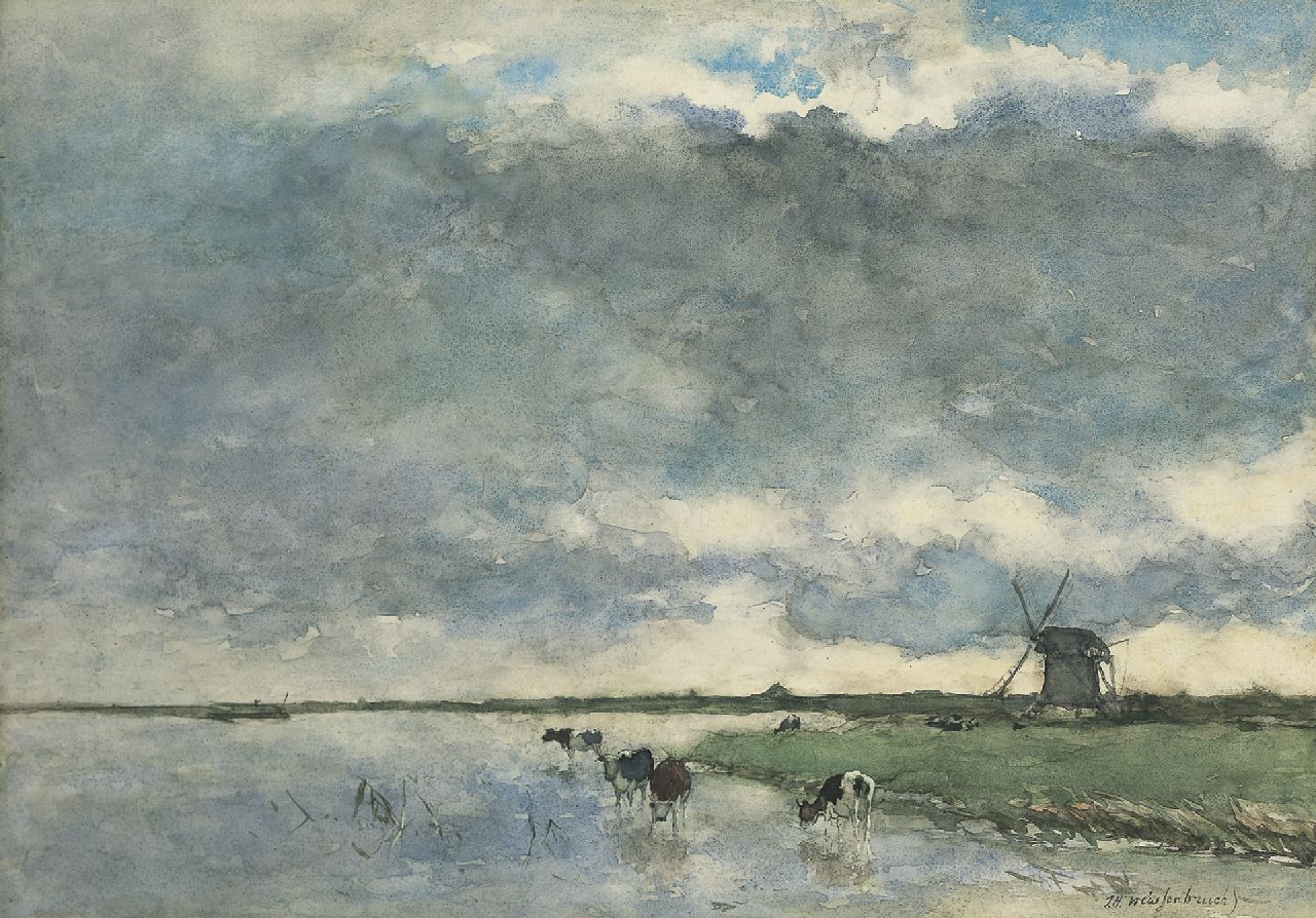 De begaafde Haagse School-schilder H.J. Weissenbruch behoorde reeds in zijn eigen tijd tot de onbetwiste meesters van de aquarel. Zijn waterverftekeningen worden zowel geroemd om de technische perfectie en transparantie in kleur en licht, als om de atmosferische en ruimtelijke verbeelding van het Hollandse landschap. Bij Den Haag schildert Weissenbruch zijn eerste natuurbeelden, waarna hij in de jaren ‘60 de polder in trekt. De aquareltechniek was voor Weissenbruch bij uitstek het medium om de atmosferische schakeringen in het waterrijke en dampige Hollandse landschap weer te geven: zoals heiigheid of regenmist zijn uitzicht soms vervaagde, zo nam het water, terwijl hij schilderde, bezit van zijn papier, om in zijn natheid de afgebeelde vormen te laten vervloeien. Weissenbruch gaf les aan V. Bauffe en T.E.A. de Bock