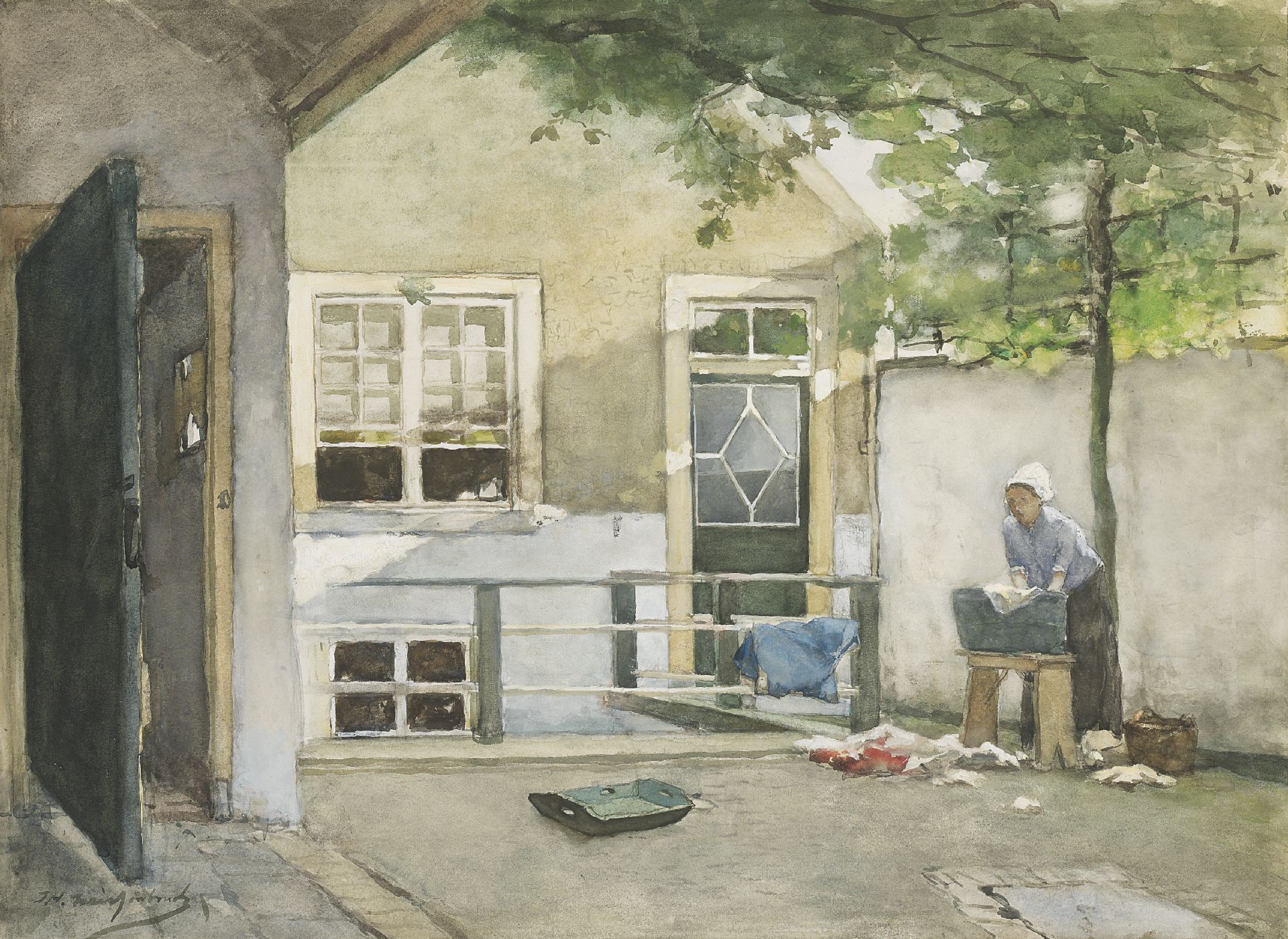 Jan Hendrik Weissenbruch kunstwerk • aquarel • tekening • voorheen te koop Wasdag: uitzicht vanuit het atelier van de schilder op de binnenplaats van zijn huis aan de Kazernestraat, Den Haag