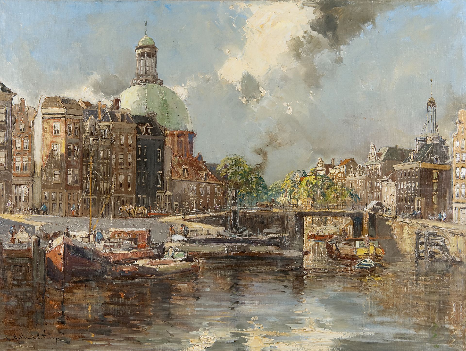 Jan Hermanus Melcher Tilmes kunstwerk • schilderij • voorheen te koop Gezicht op het Singel, Amsterdam, met de Ronde Lutherse Kerk