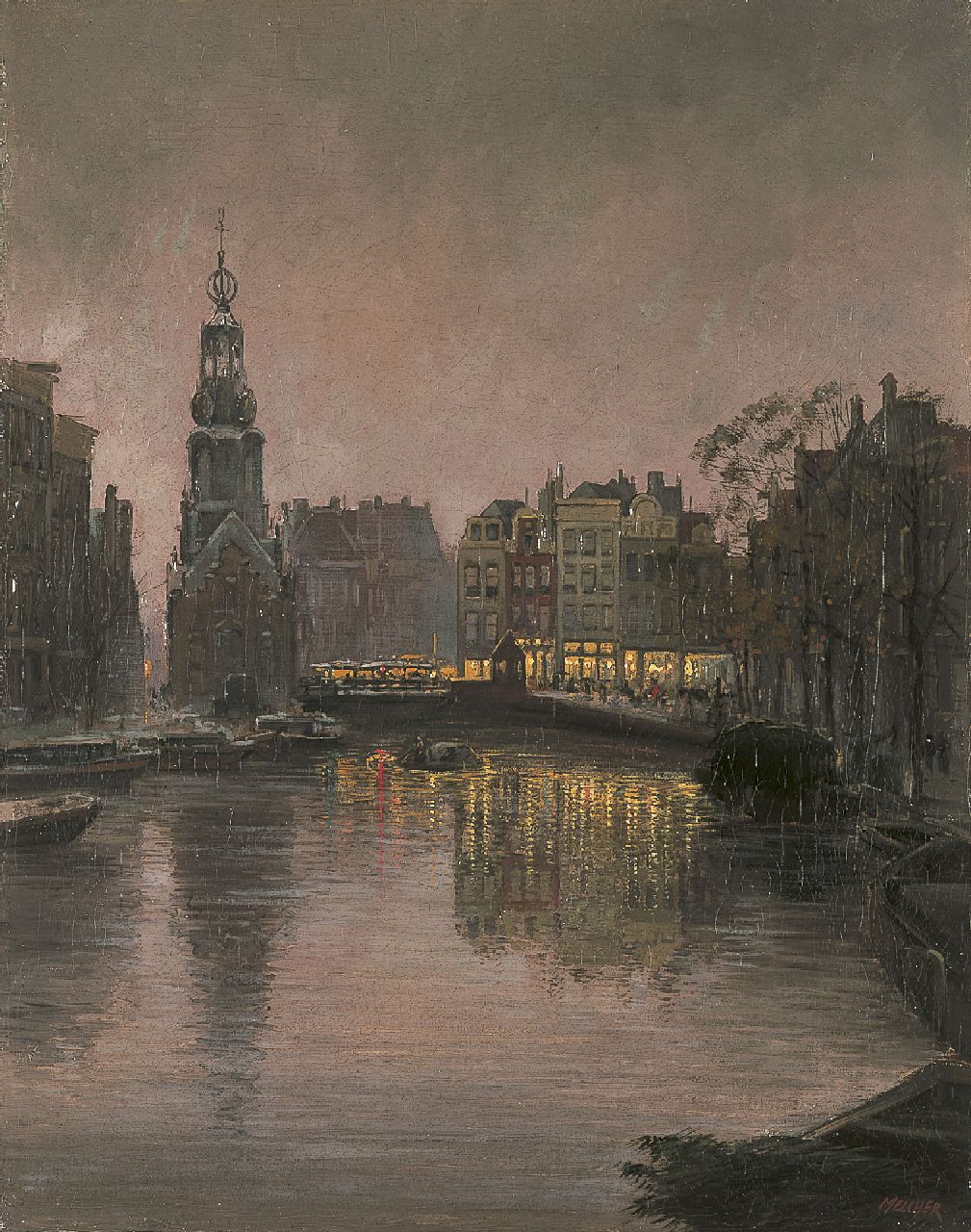 Jan Hermanus Melcher Tilmes kunstwerk • schilderij • voorheen te koop Gezicht op het Singel en Muntplein bij avond, Amsterdam