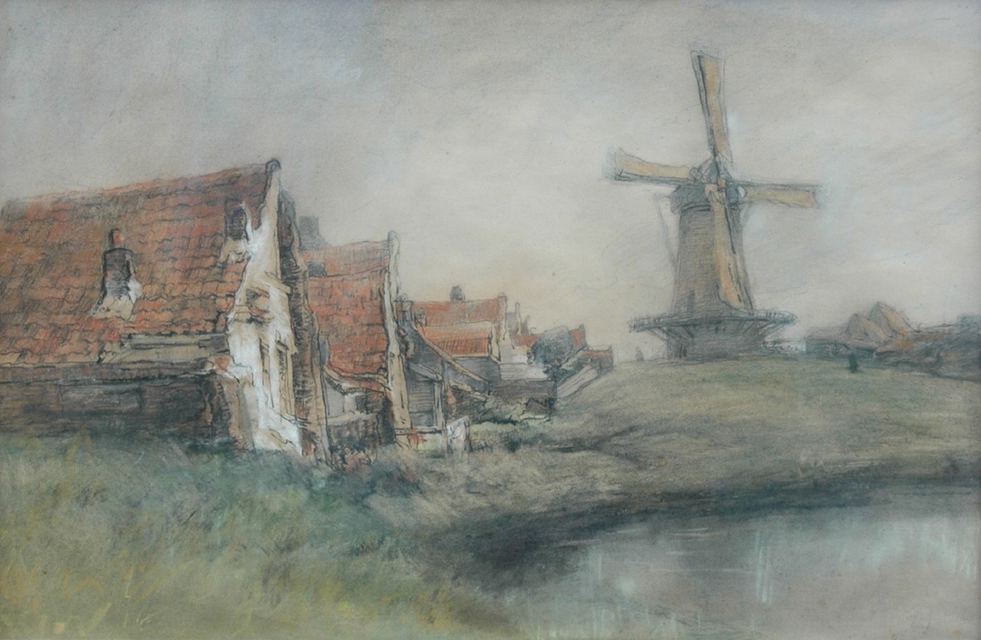 Wijsmuller J.H.  | Jan Hillebrand Wijsmuller, Huizen en molen in Hollands landschap, gekleurd krijt op papier 40,0 x 59,0 cm, gesigneerd rechtsonder