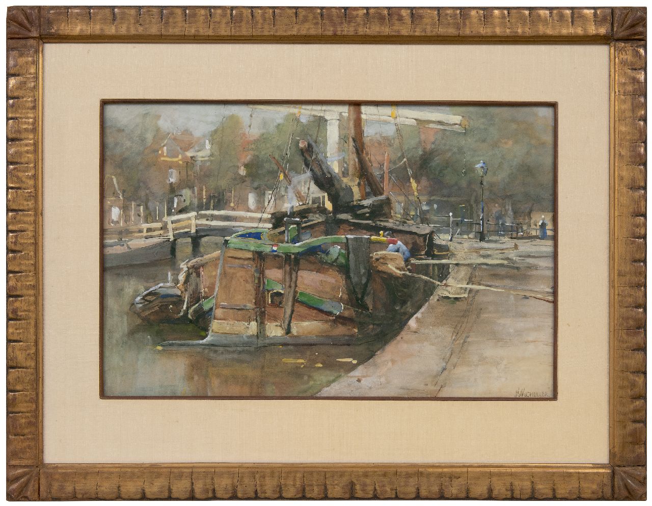 Jan Hillebrand Wijsmuller kunstwerk • aquarel • tekening • te koop Afgemeerde tjalk aan de kade