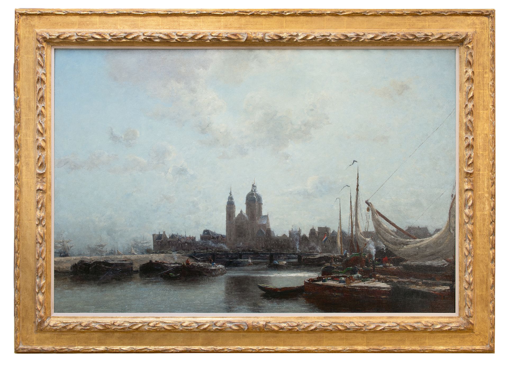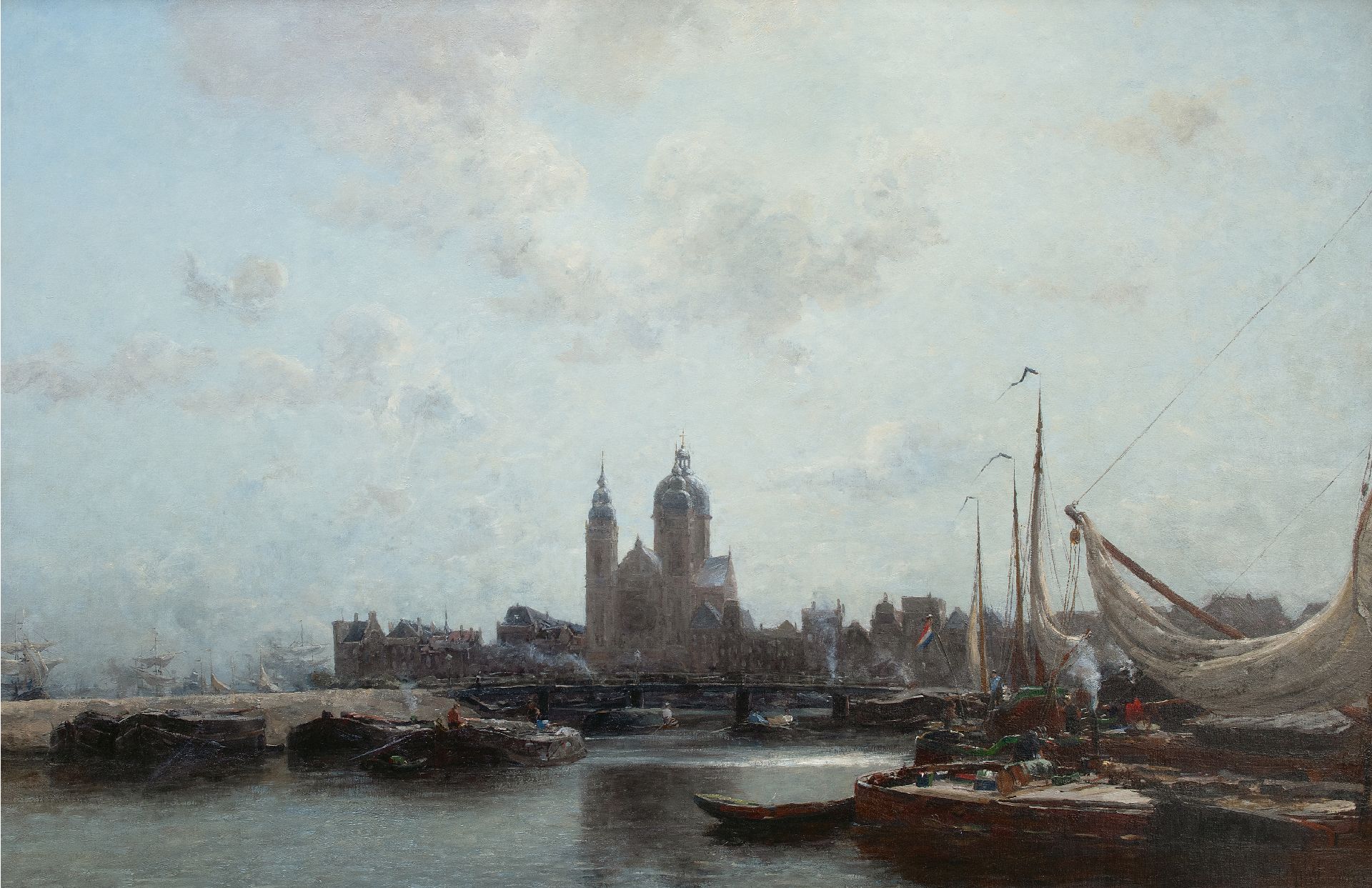 Jan Hillebrand Wijsmuller kunstwerk • schilderij • te koop Amsterdams havengezicht met de St. Nicolaaskerk