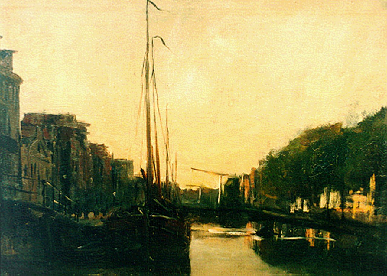 Jan Hillebrand Wijsmuller kunstwerk • schilderij • voorheen te koop Amsterdamse gracht bij avondschemering
