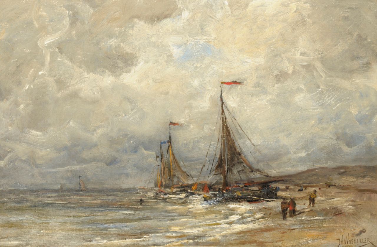 Jan Hillebrand Wijsmuller kunstwerk • schilderij • voorheen te koop Bomschuiten op het strand bij Egmond aan Zee