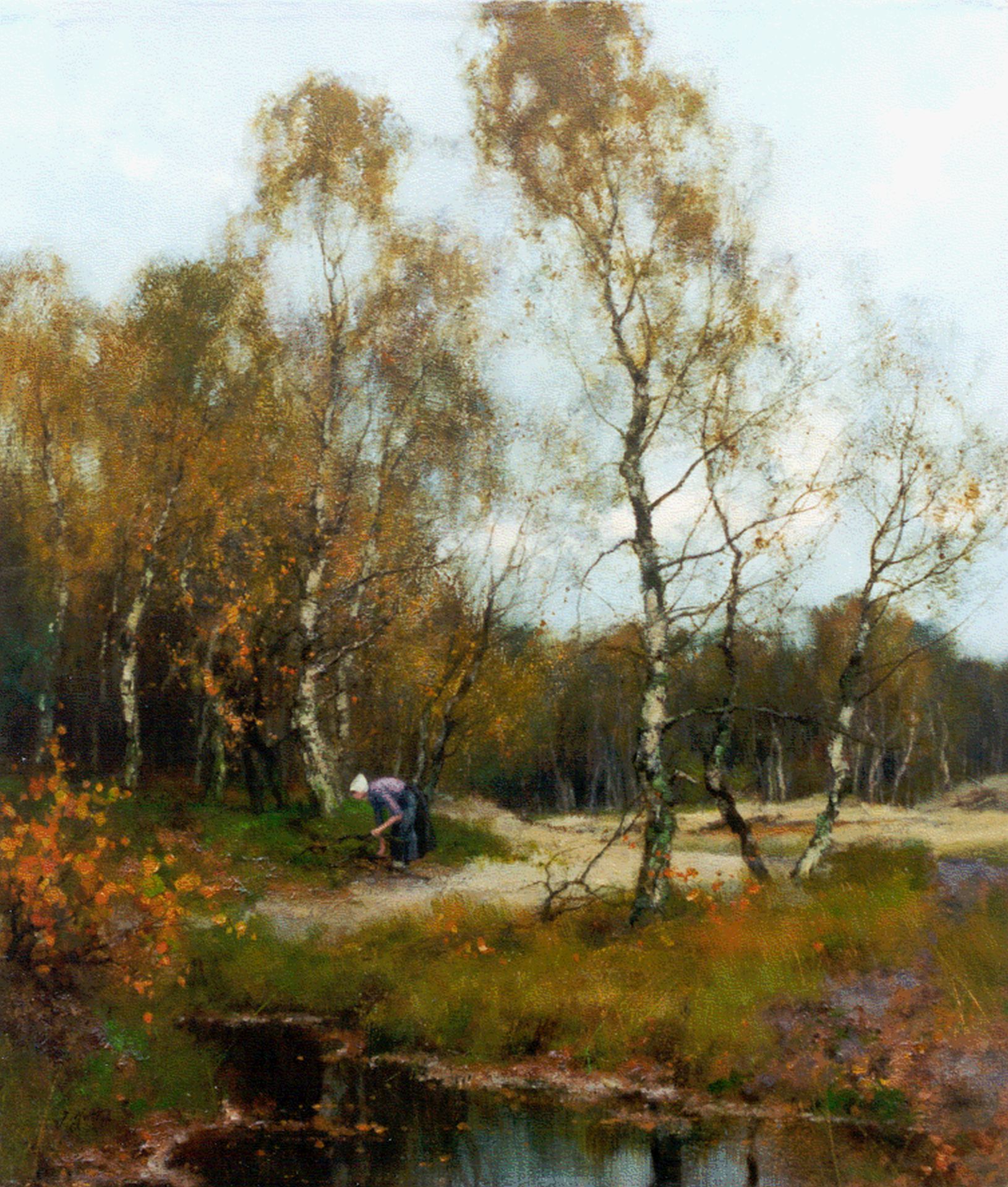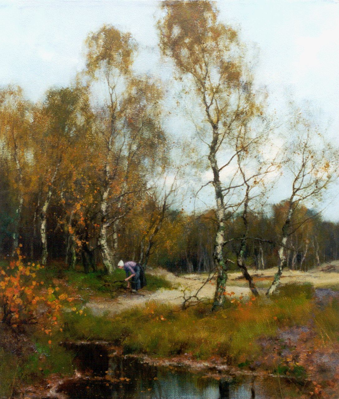 Jan Holtrup kunstwerk • schilderij • voorheen te koop Berken met sprokkelend vrouwtje