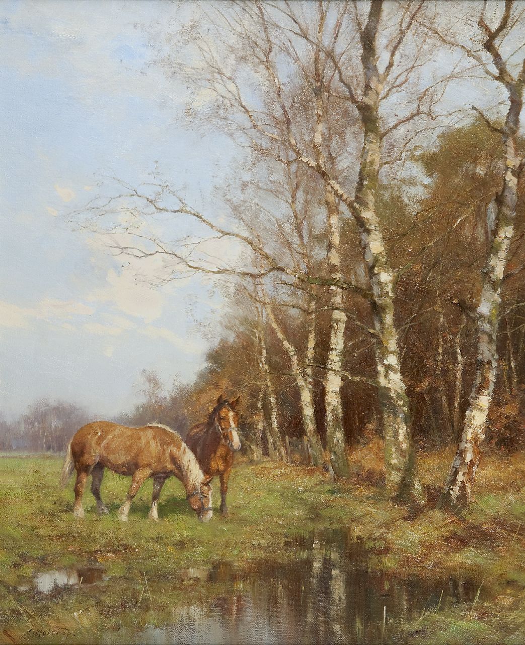Jan Holtrup kunstwerk • schilderij • voorheen te koop Werkpaarden in weidelandschap te Groesbeek
