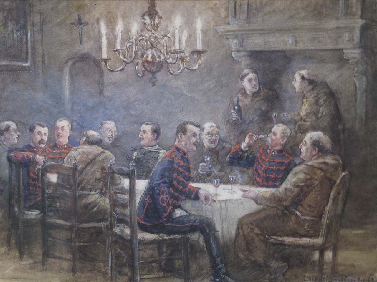 Jan Hoynck van Papendrecht kunstwerk • aquarel • tekening • voorheen te koop Officieren van het 1e Regiment Huzaren en een Gele Rijder te gast in een klooster