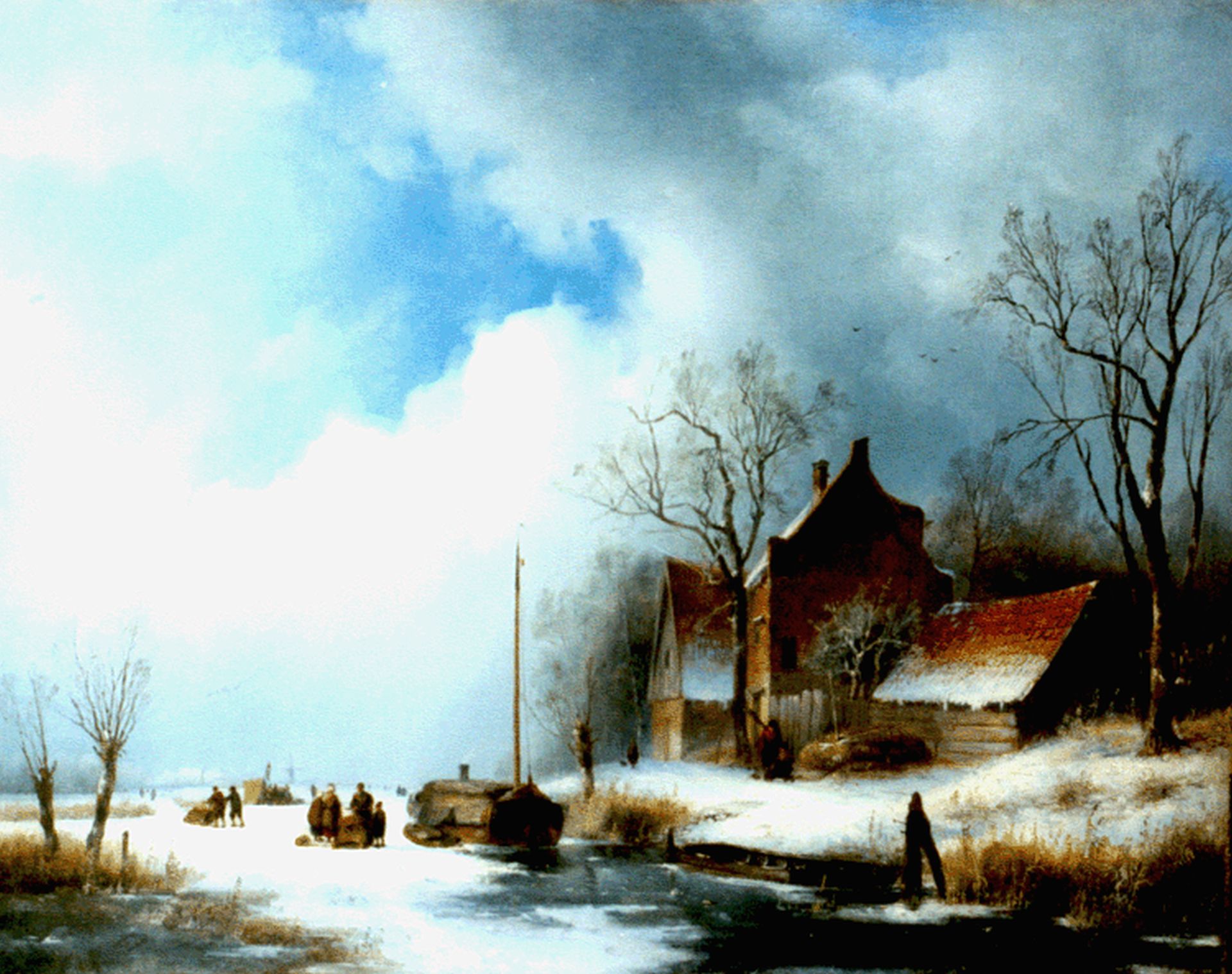 Jan Jacob Spohler kunstwerk • schilderij • voorheen te koop Boerenhoeve aan een bevroren plas