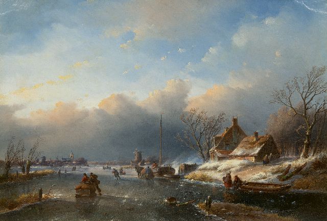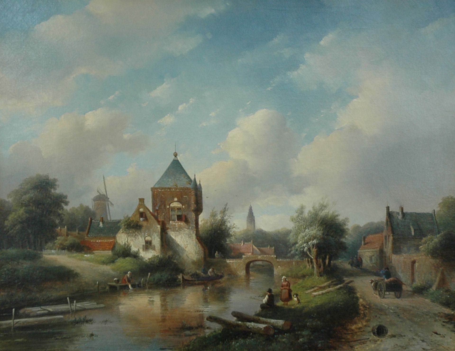 Jan Jacob Spohler kunstwerk • schilderij • voorheen te koop Dorpsgezicht met weg langs een rivier