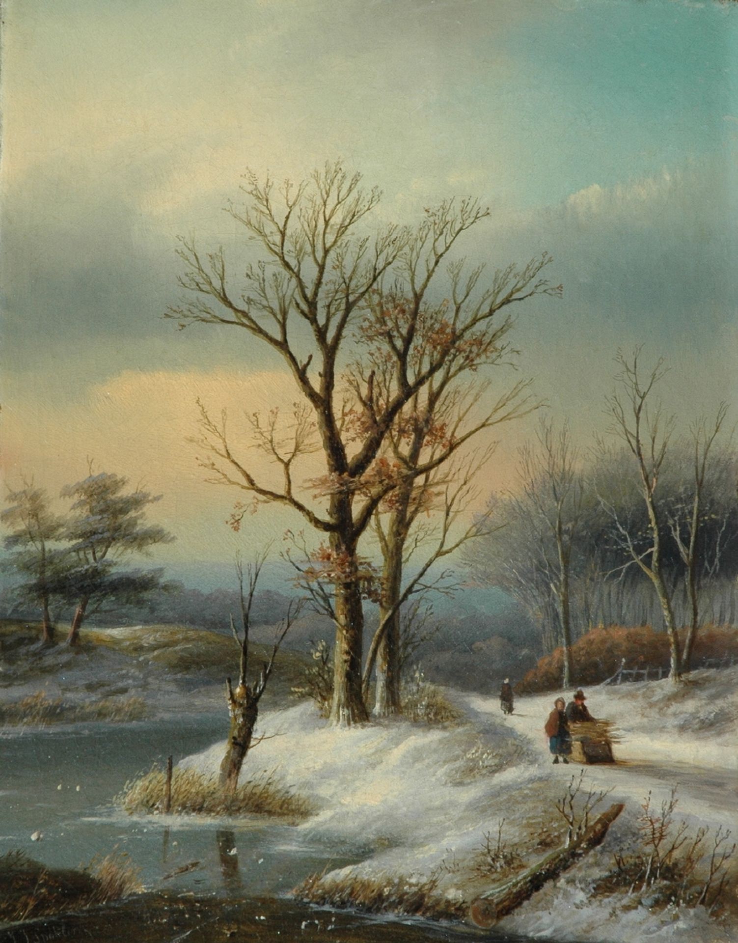 Jan Jacob Spohler kunstwerk • schilderij • voorheen te koop Figuren met duwslede op besneeuwd winters bospad