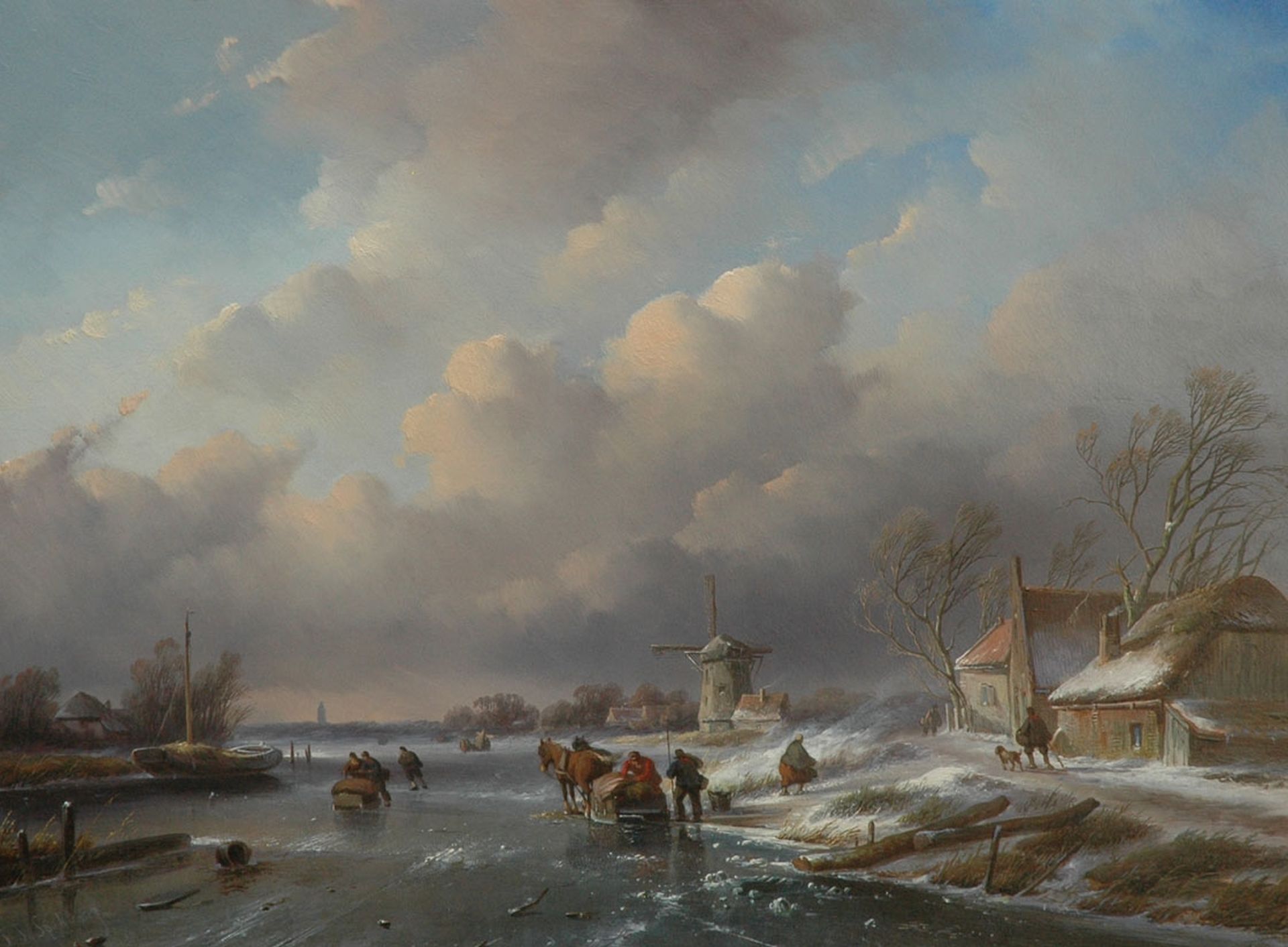 Jan Jacob Spohler kunstwerk • schilderij • voorheen te koop Figuren met sledes op het ijs