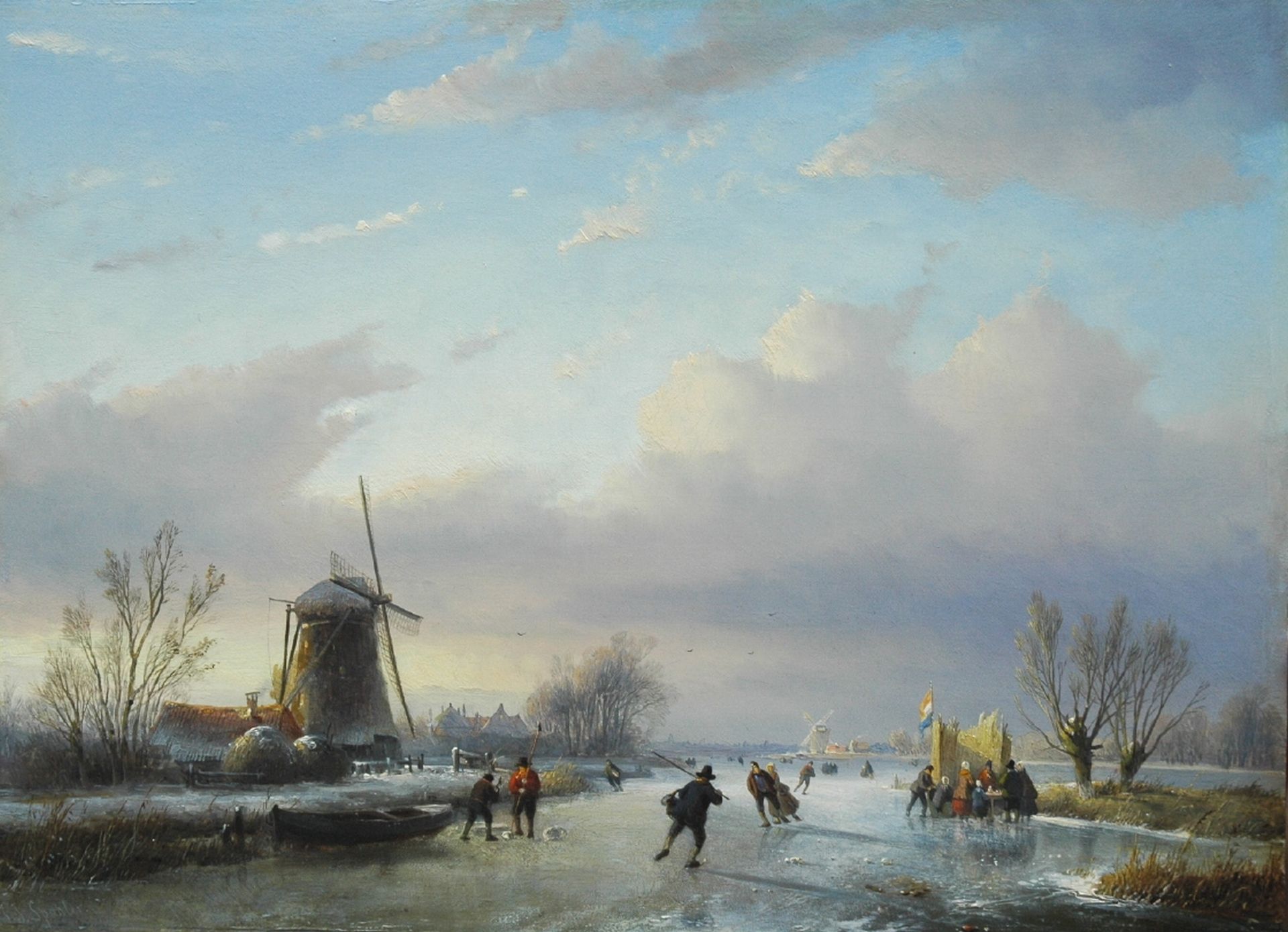 Jan Jacob Spohler kunstwerk • schilderij • voorheen te koop Hollands winterlandschap met schaatsers en koek-en-zopie