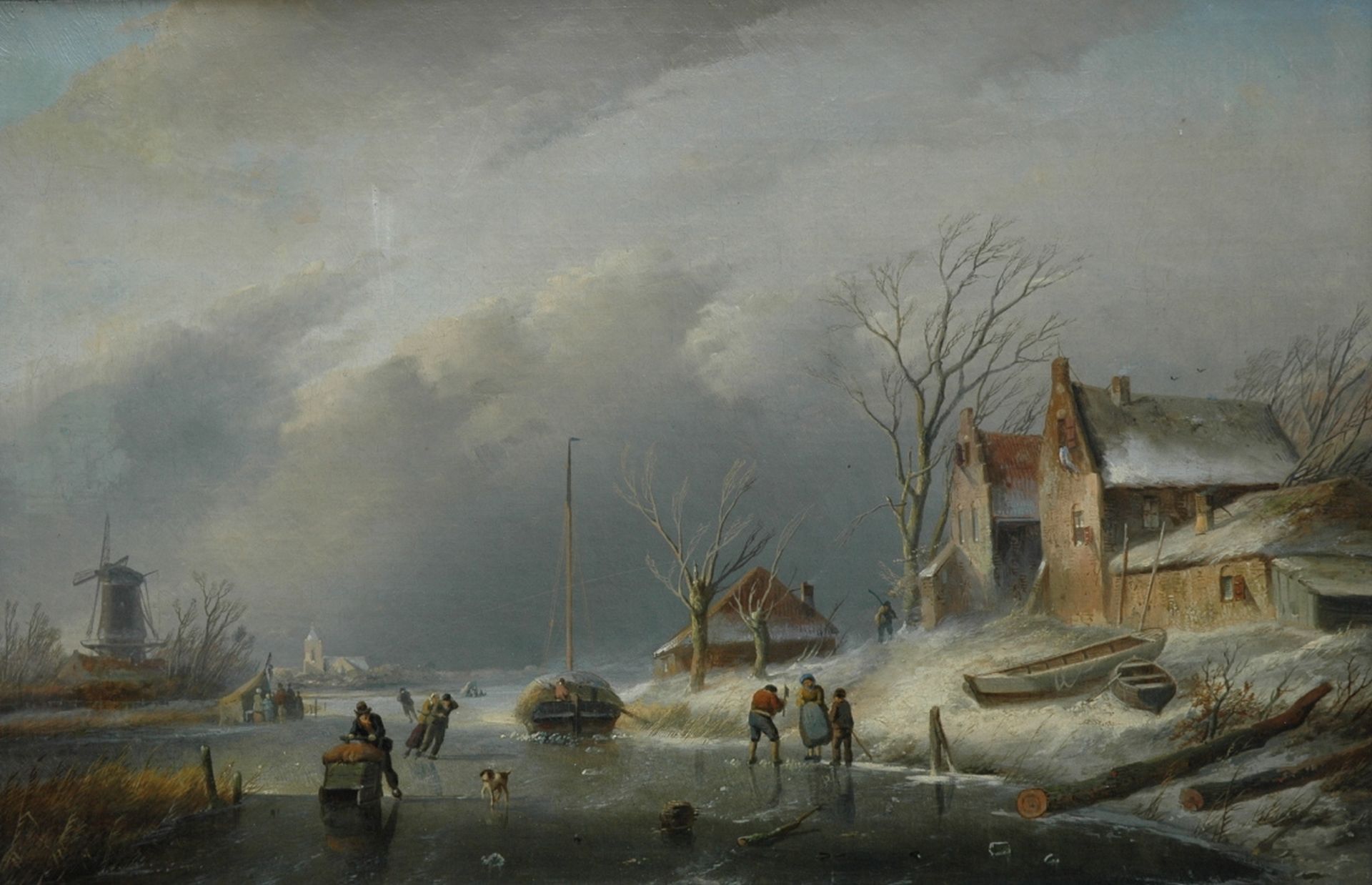 Jan Jacob Spohler kunstwerk • schilderij • voorheen te koop IJsgezicht met schaatsers en ingevroren hooischuit