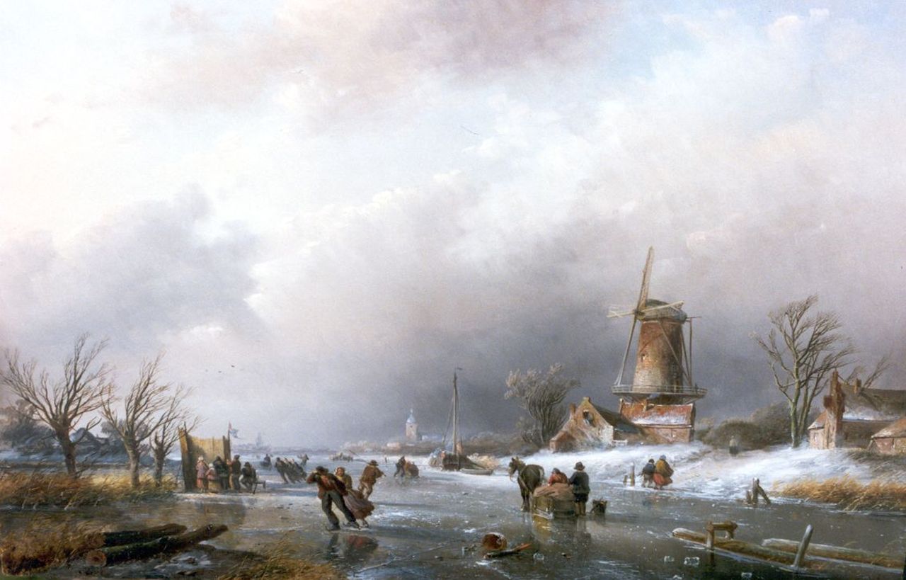Jan Jacob Spohler kunstwerk • schilderij • voorheen te koop Schaatsers en koek-en-zopie in winters landschap