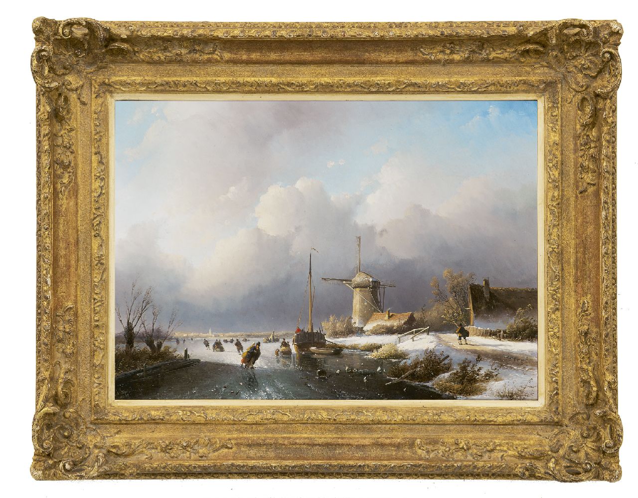 Jan Jacob Spohler kunstwerk • schilderij • voorheen te koop Schaatsplezier op een vaart bij een molen