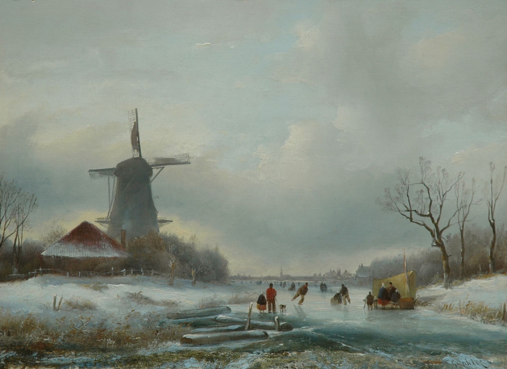 Jan Jacob Spohler kunstwerk • schilderij • voorheen te koop Schaatspret bij een molen