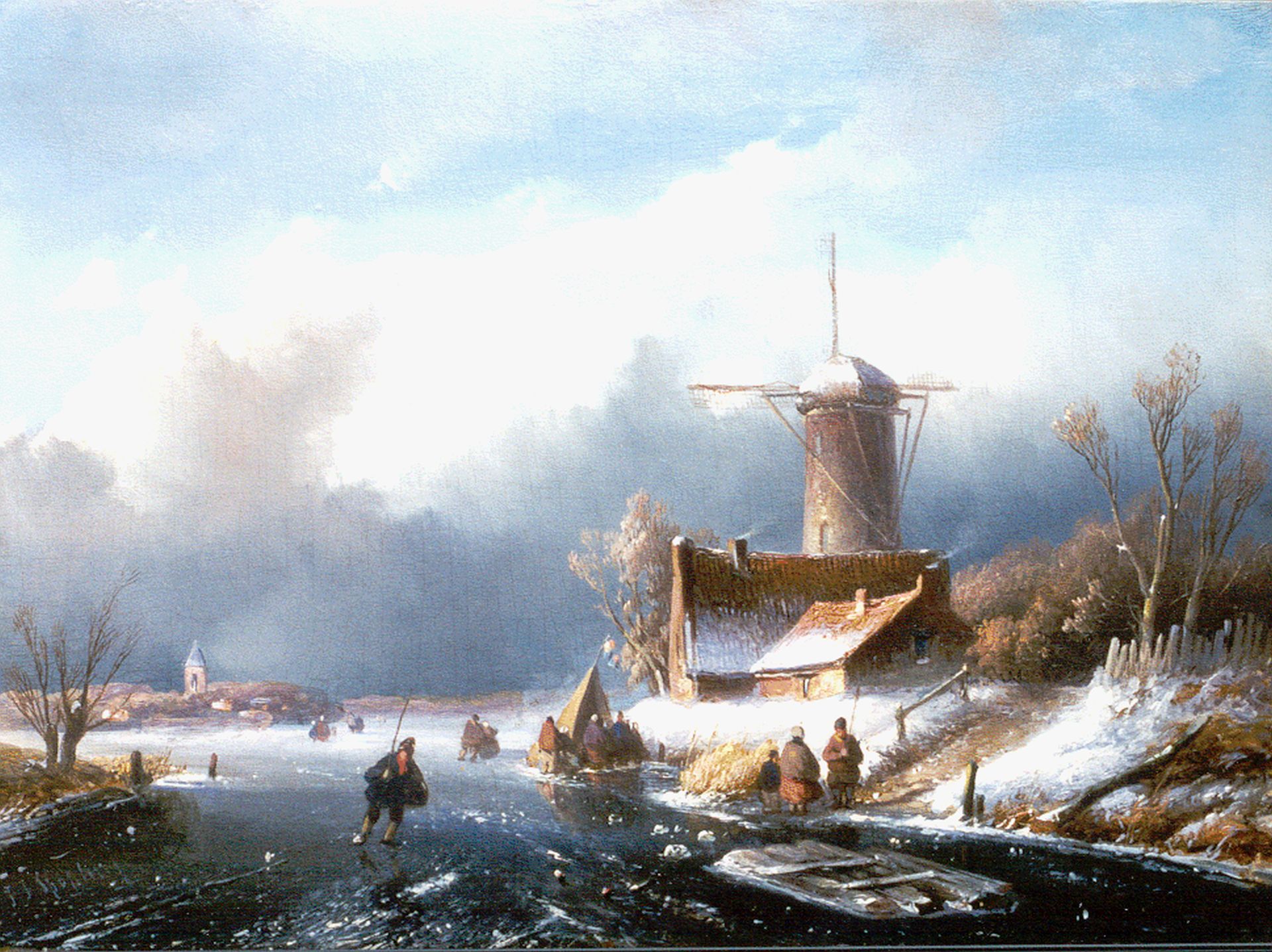Jan Jacob Spohler kunstwerk • schilderij • voorheen te koop Winterlandschap met schaatsers bij een molen