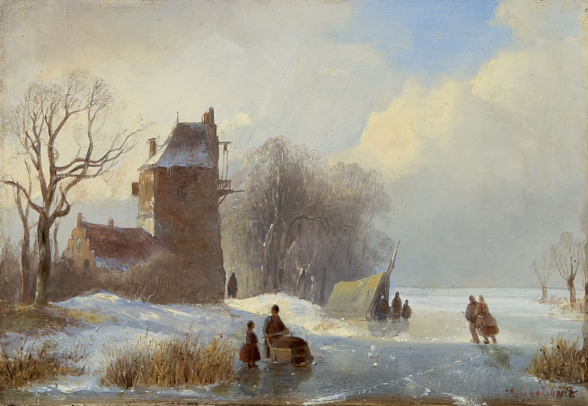 Jan Jacob Spohler kunstwerk • schilderij • voorheen te koop Winterlandschap met schaatsers en koek-en-zopie