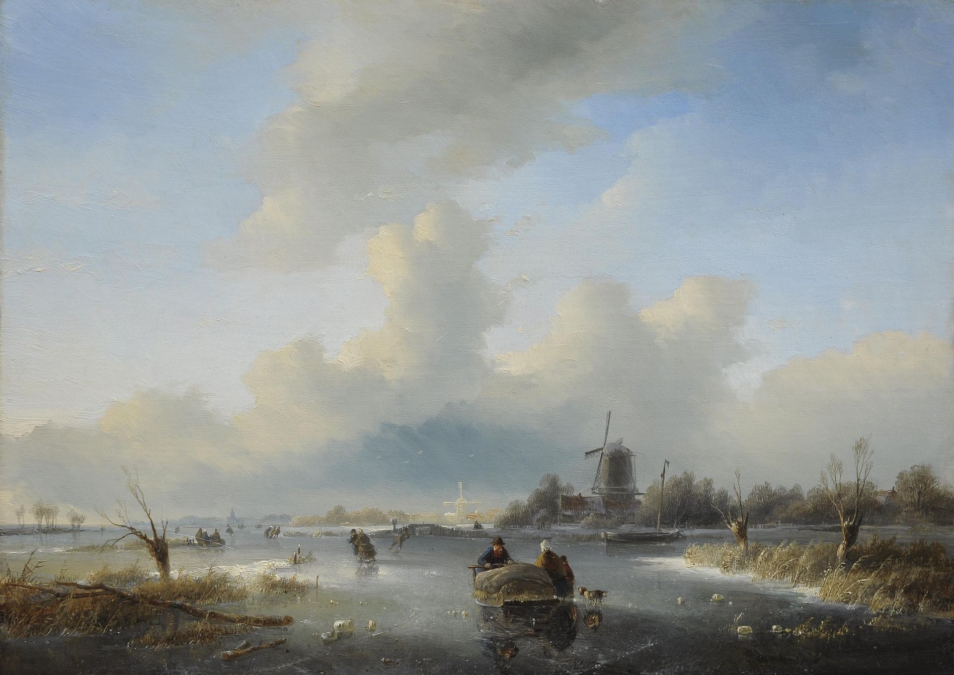 Jan Jacob Spohler kunstwerk • schilderij • voorheen te koop Winterlandschap met schaatsers en sneeuwbui aan de horizon