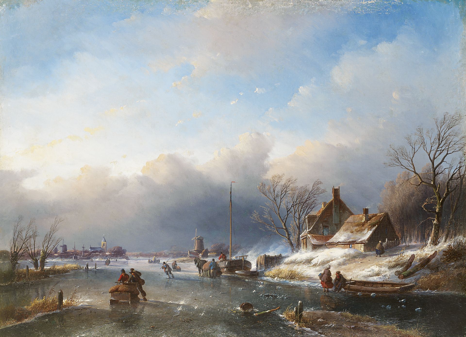 Jan Jacob Spohler kunstwerk • schilderij • voorheen te koop Winterlandschap met vele figuren op het ijs