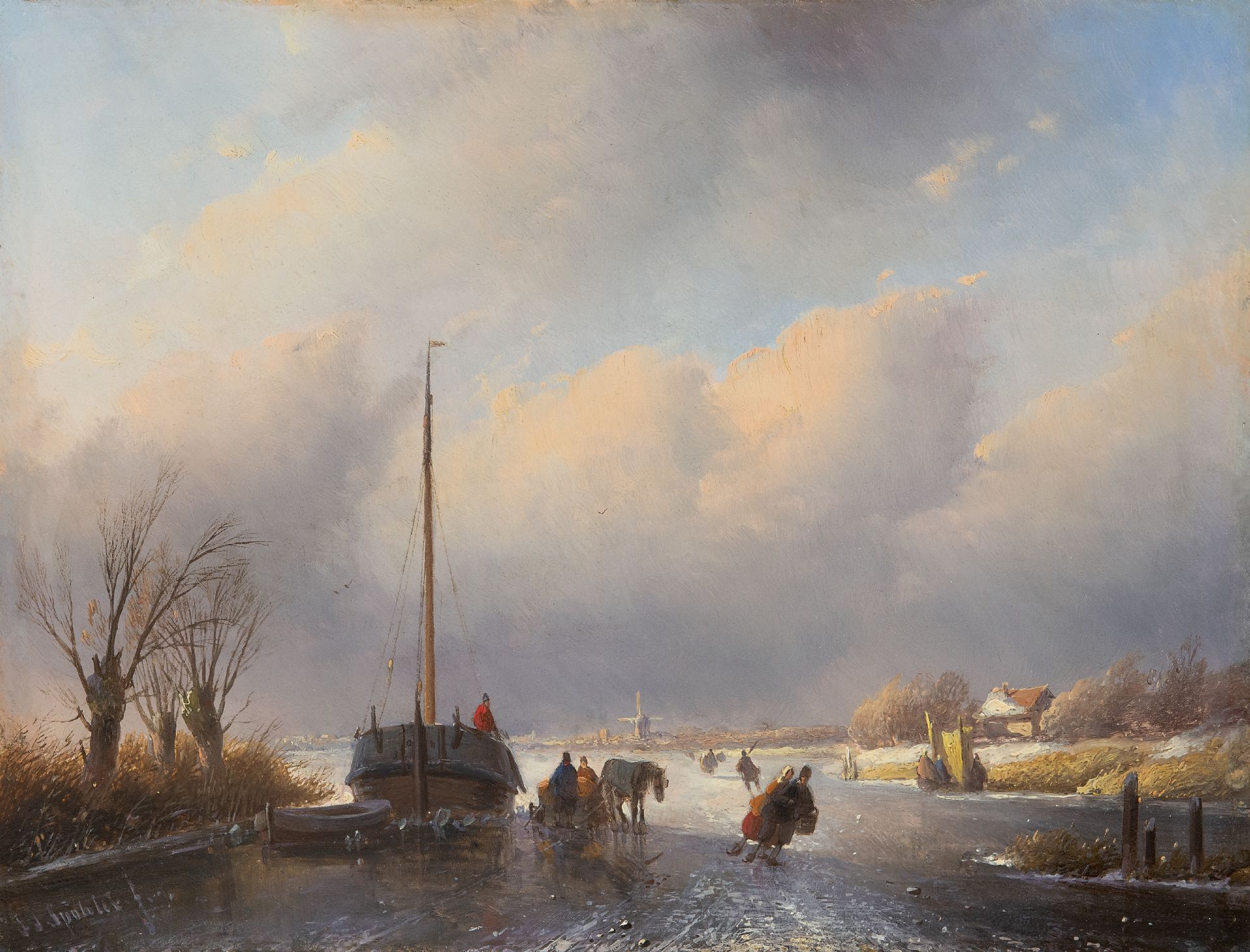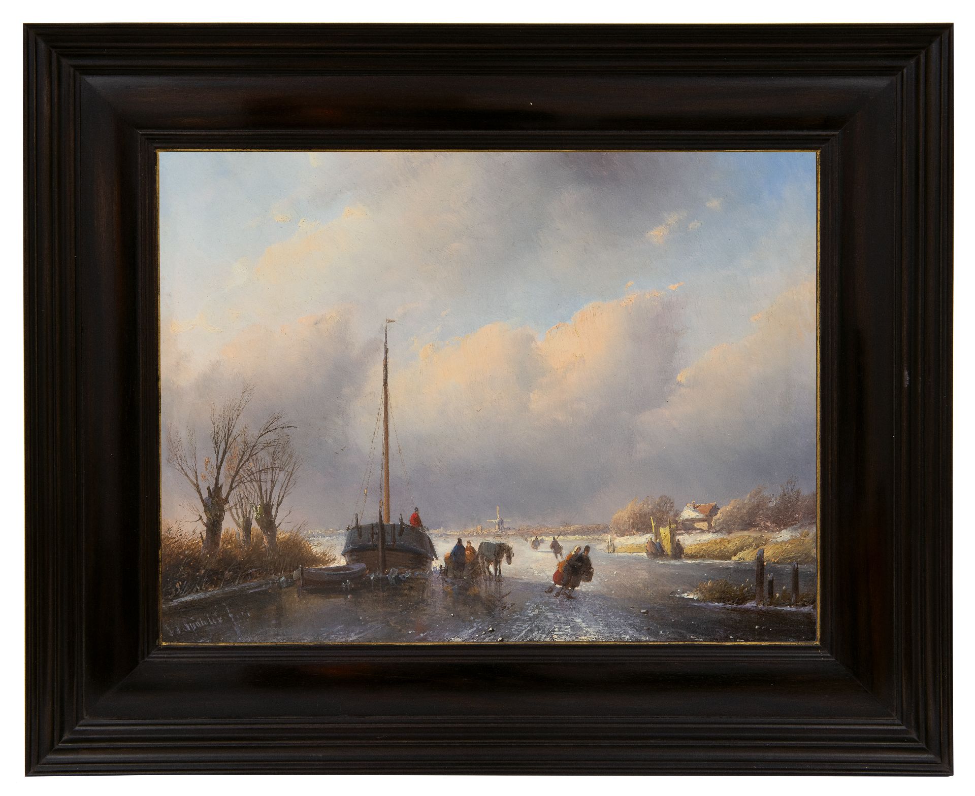Jan Jacob Spohler kunstwerk • schilderij • voorheen te koop Winters rivierlandschap met schaatsvolk en een paardenslee
